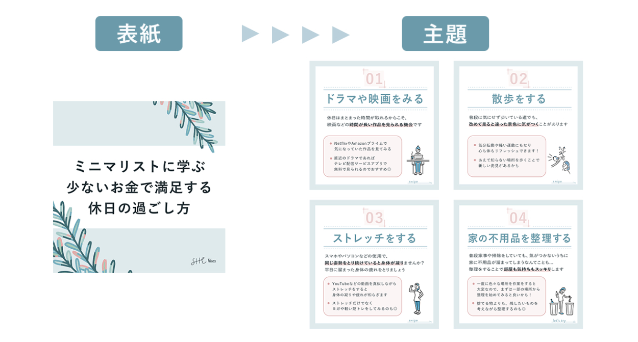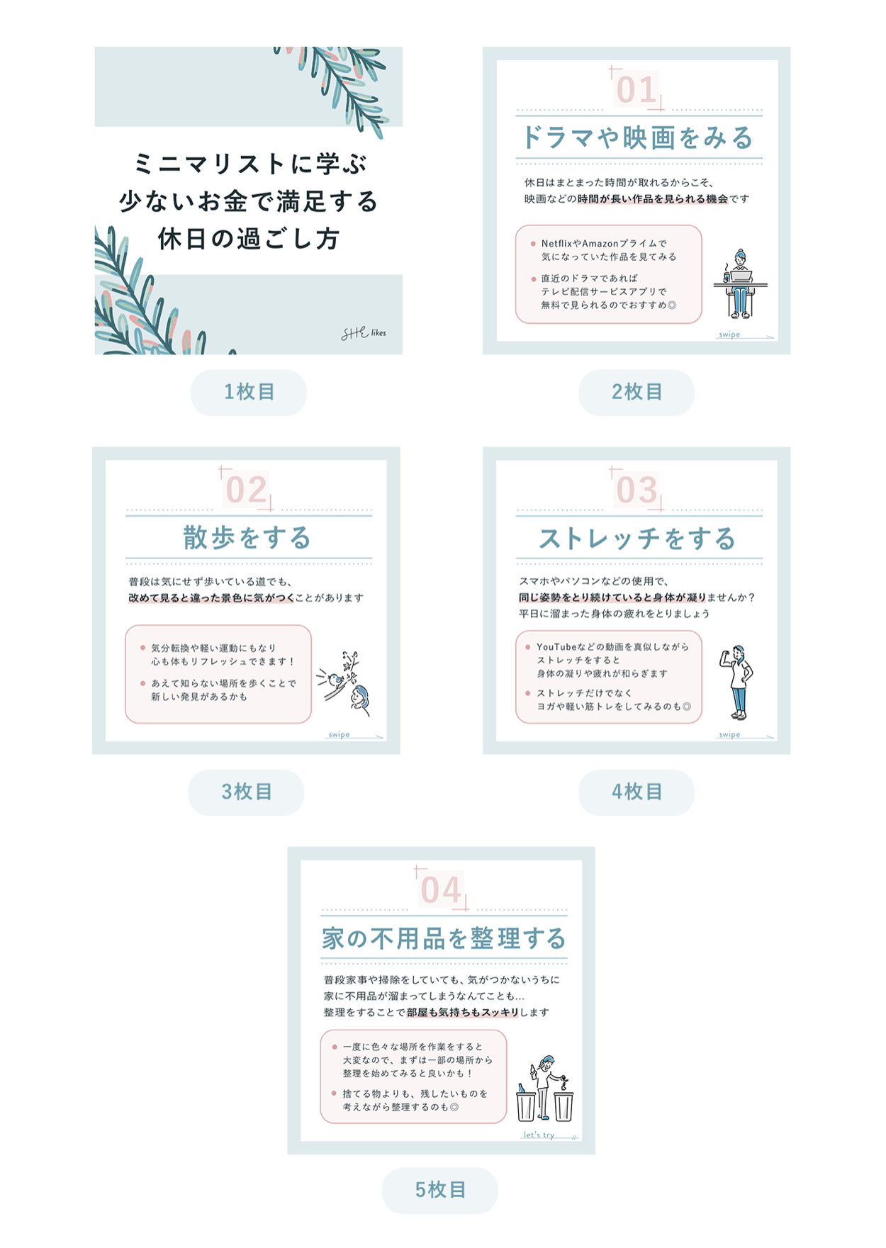 主題(3-5枚目):休日の過ごし方を1ページごとに1つずつ紹介