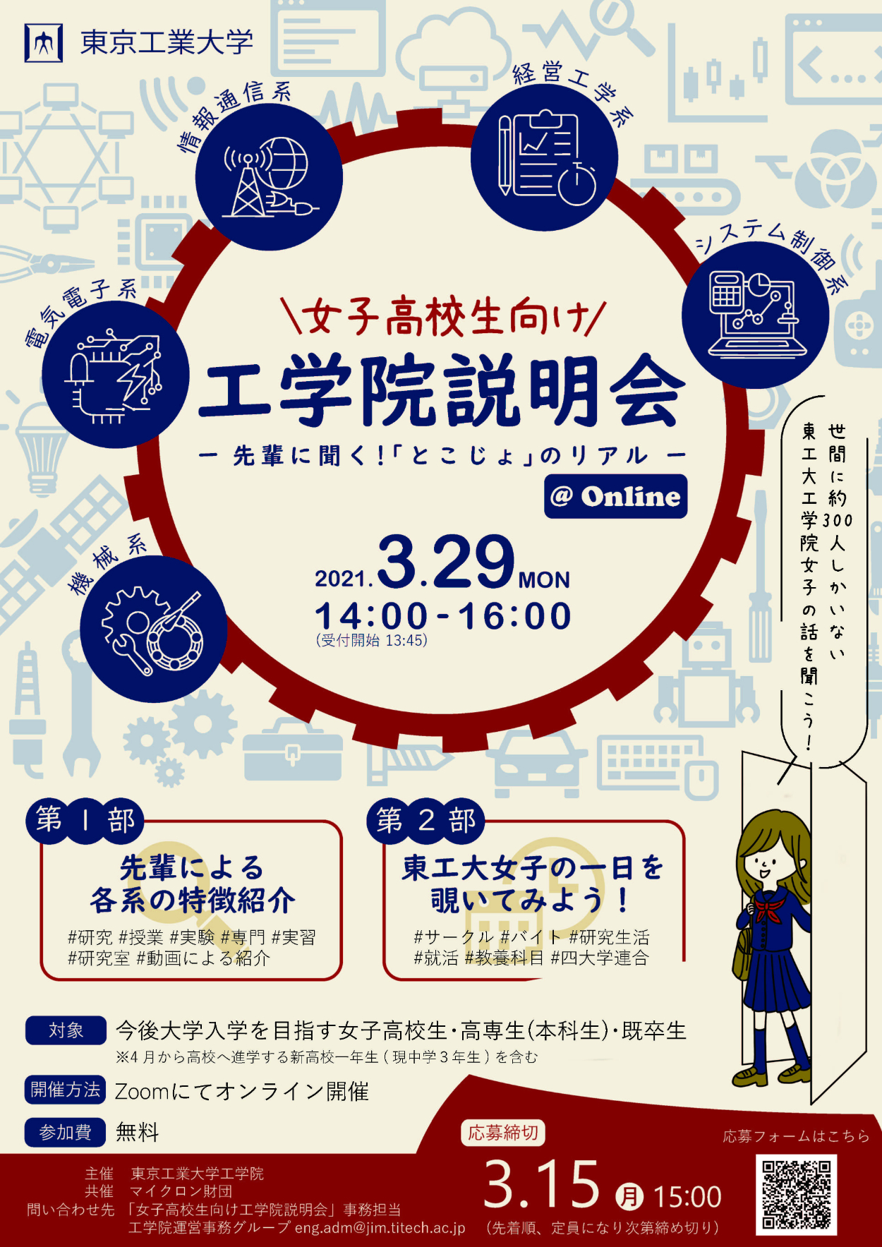 東京工業大学主催「女子高校生向け工学院説明会~先輩に聞く!「とこじょ」のリアル~」に機械系の女子学生を代表しTAとして参加、およびポスター等のビジュアルの作成を担当した。