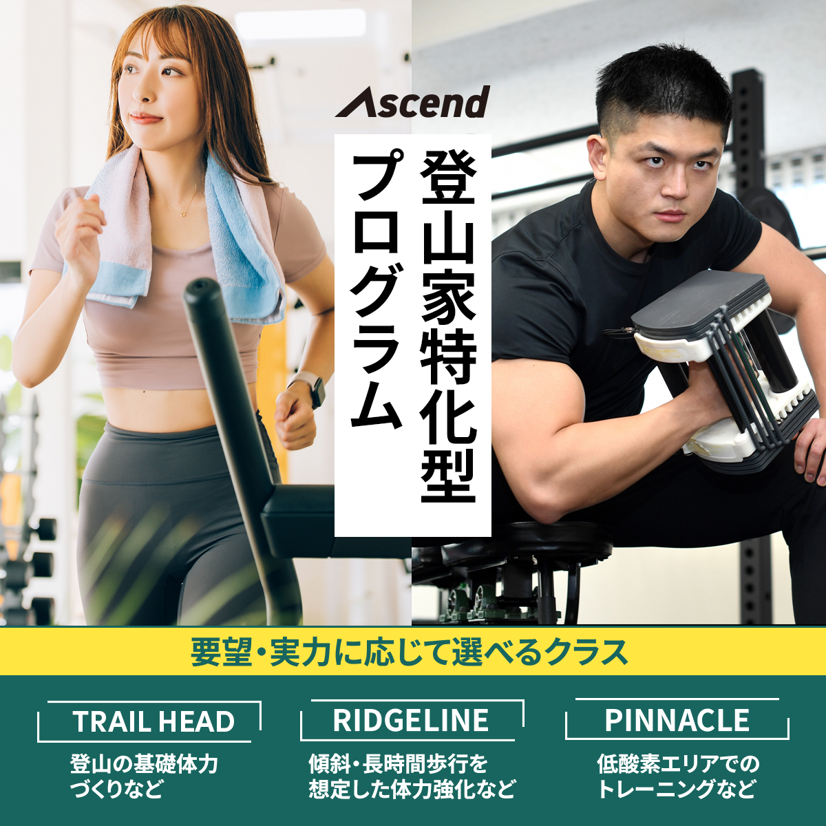 登山家向けジム/バナー かがみ まゆこ デザイナー/イラストレーター 登山家向けのジムのバナーを自主制作しました。無料体験のバナーターゲット:登山好きの20~30代の男性実力や目的別にクラスが選べることを押し出したバナーターゲット:登山好きの20~30代