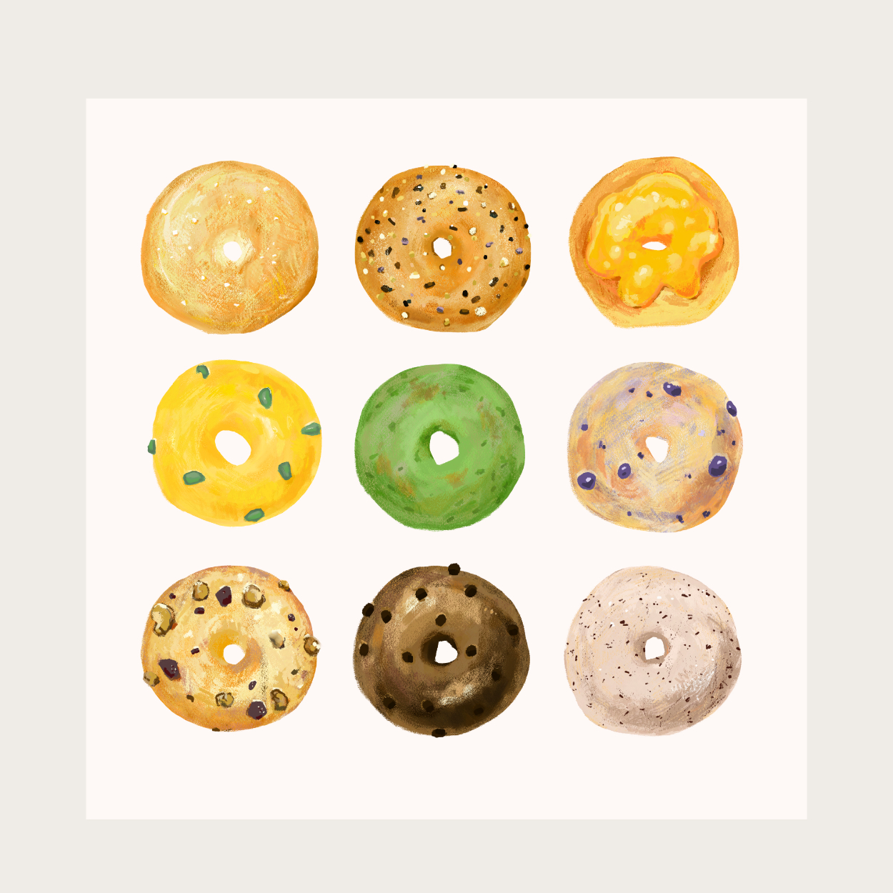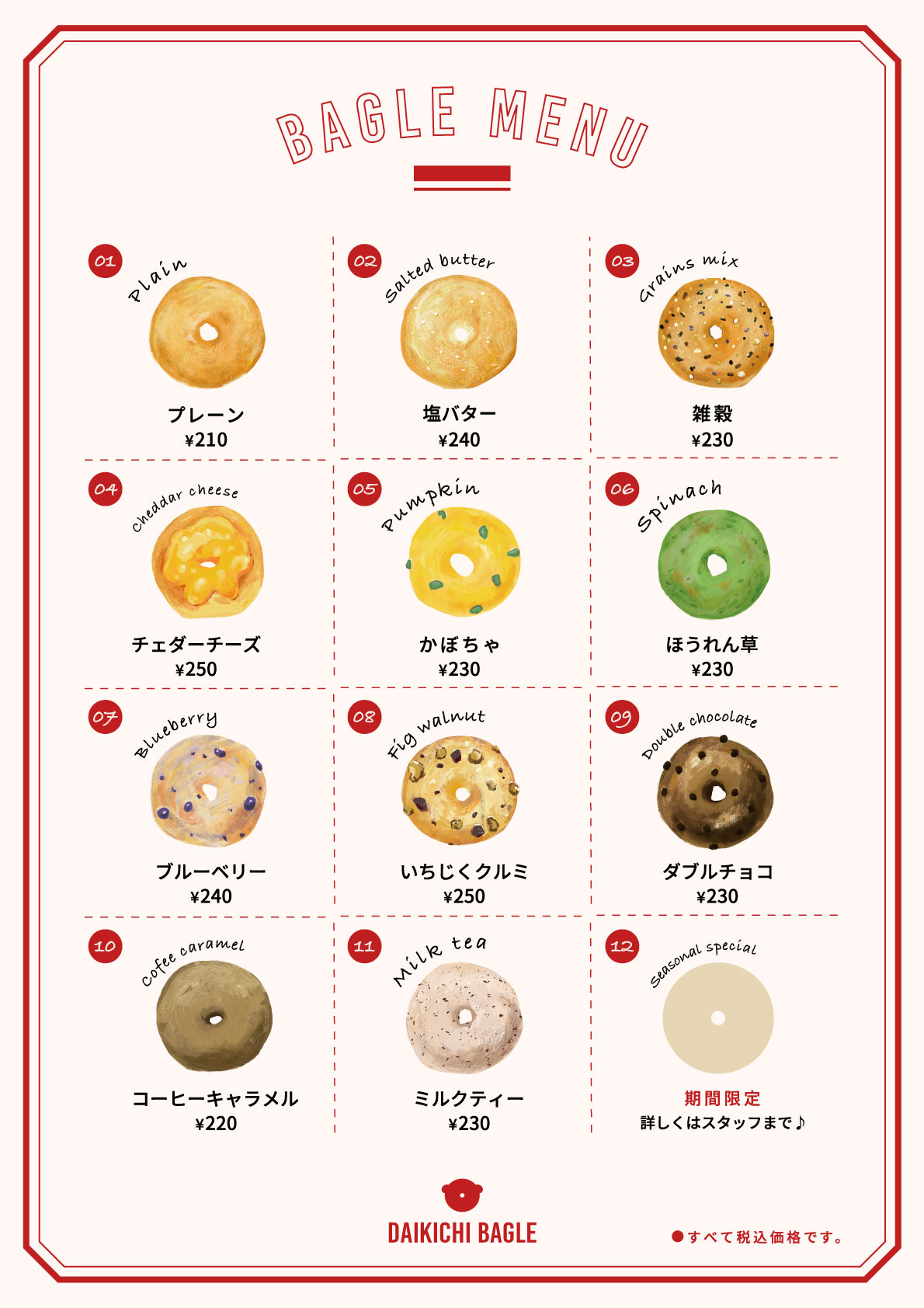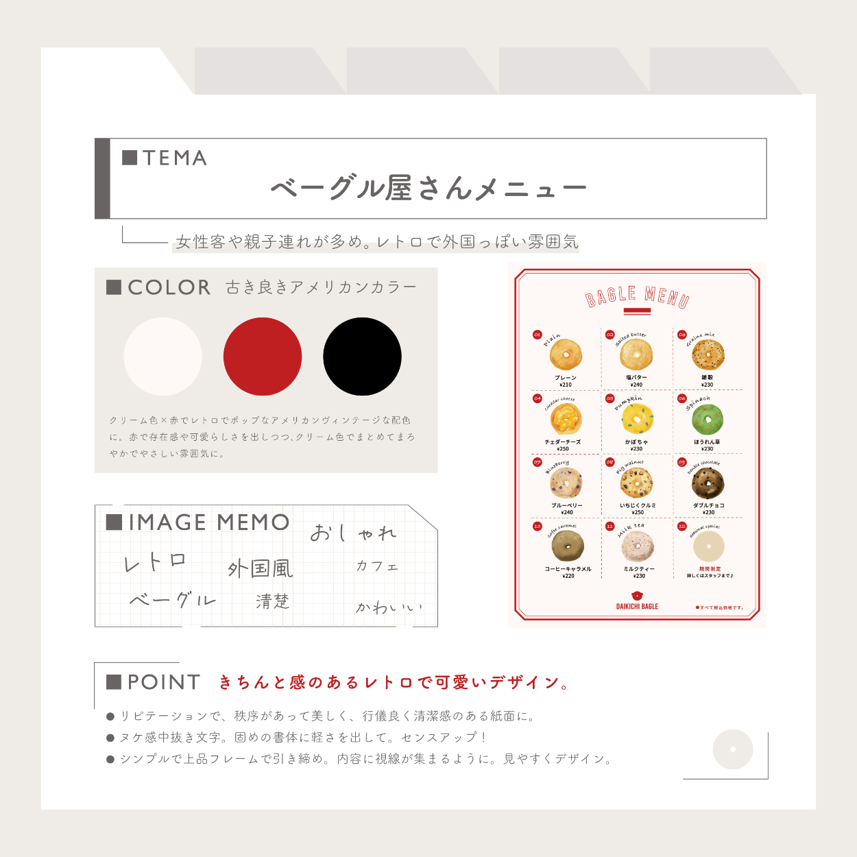 【自主制作】ベーグル屋さんメニュー(イラスト&デザイン) KEIKO UEDA デザイナー/イラストレーター OVERVIEW 2024.7.21/制作時間:9時間/制作ツール:illustrator,adobefresco/コンセプト:きちんと感のある上品で可愛らしい外国風デザイン。 YEAR 2024