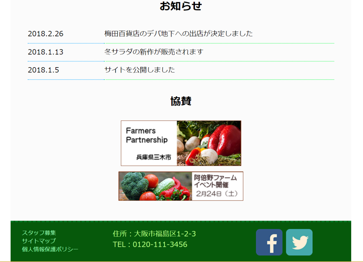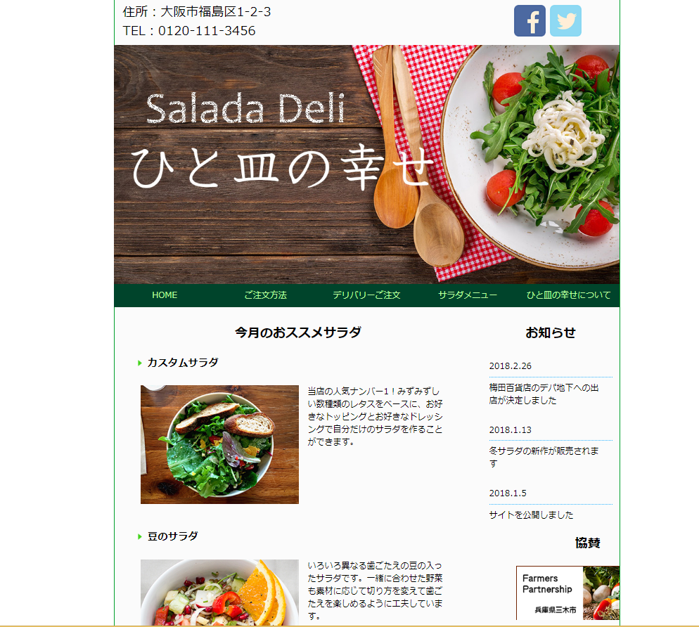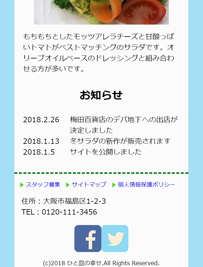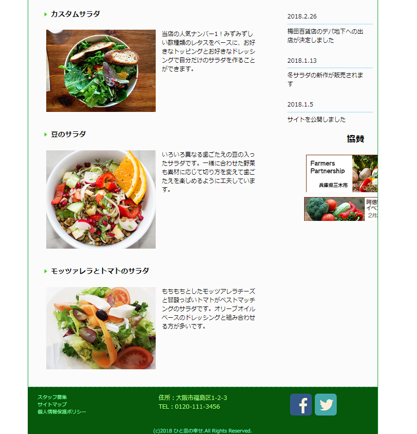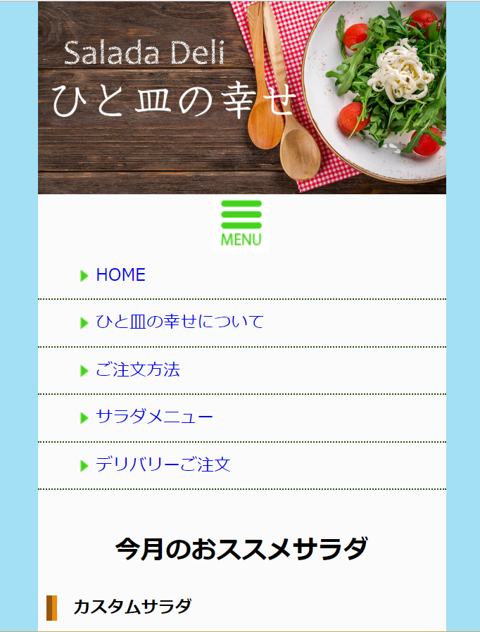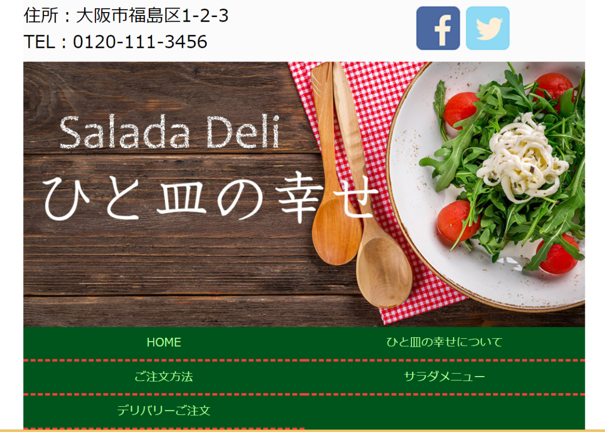 惣菜店のホームページを作成(レスポンシブ対応) Fuminori Hosokawa OVERVIEW Deamweaverにて作成。 概要惣菜店のホームページを、PC,タブレット,スマートフォンそれぞれの画面に対応するように作成。Dremweaverを使用し作成。所要時間ひな形・・・45分PC対応・・・45分タブレット対応・・・30分スマートフォン・・・30分注意画像や写真は教材のものを使用。