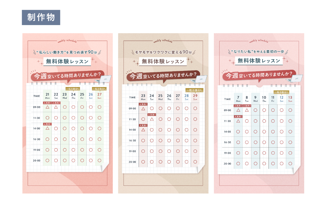 - 毎週配信するため飽きさせないよう、雰囲気の異なる3種類の配色・コピーを制作。