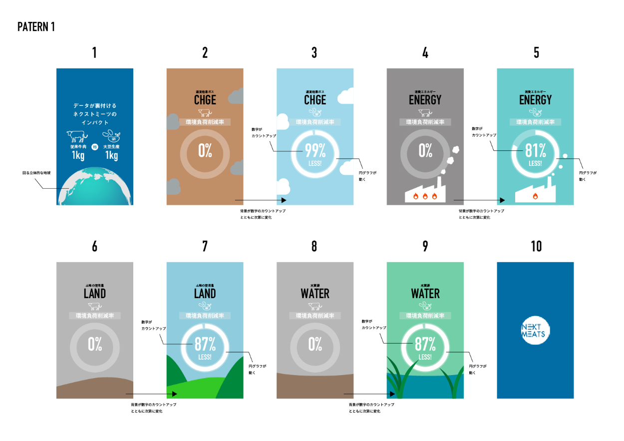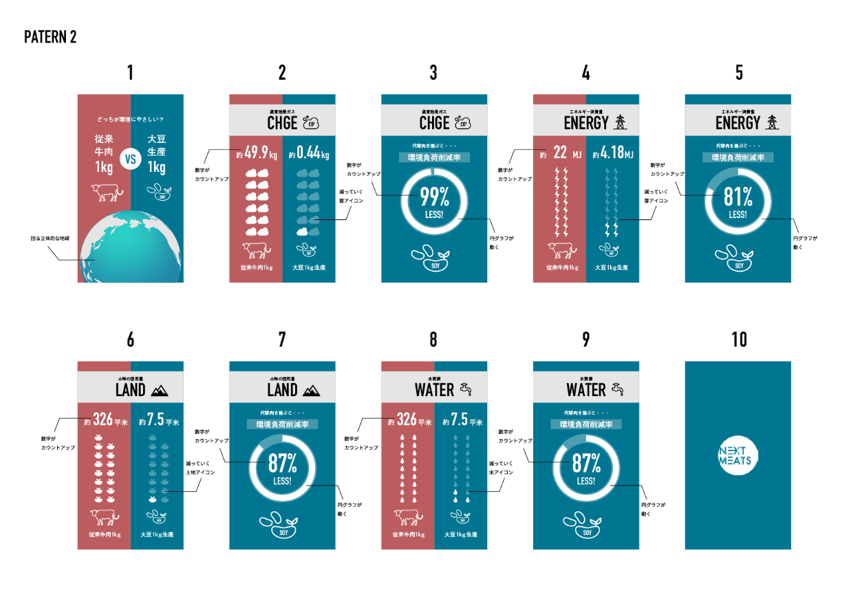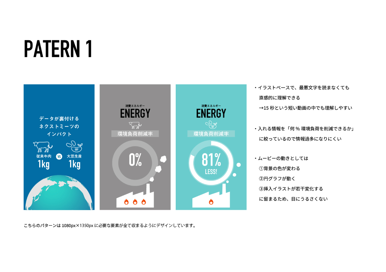 大豆で作られた代替肉を開発・販売する株式会社ネクストミーツのInstagramのリール投稿用に、15秒のインフォグラフィックスムービーを作成しました。