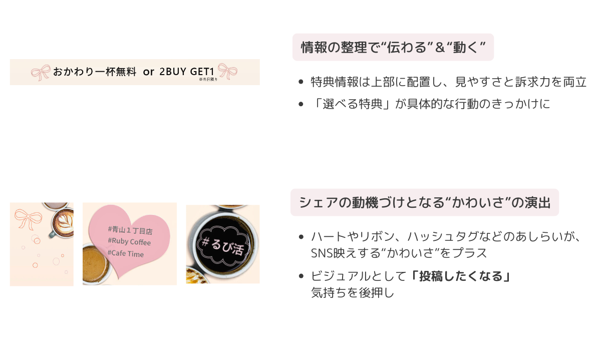 ・「選べる特典」での来店促進 - キーワード: トレンド感/チル/キャッチー/やさしさ/かわいさ