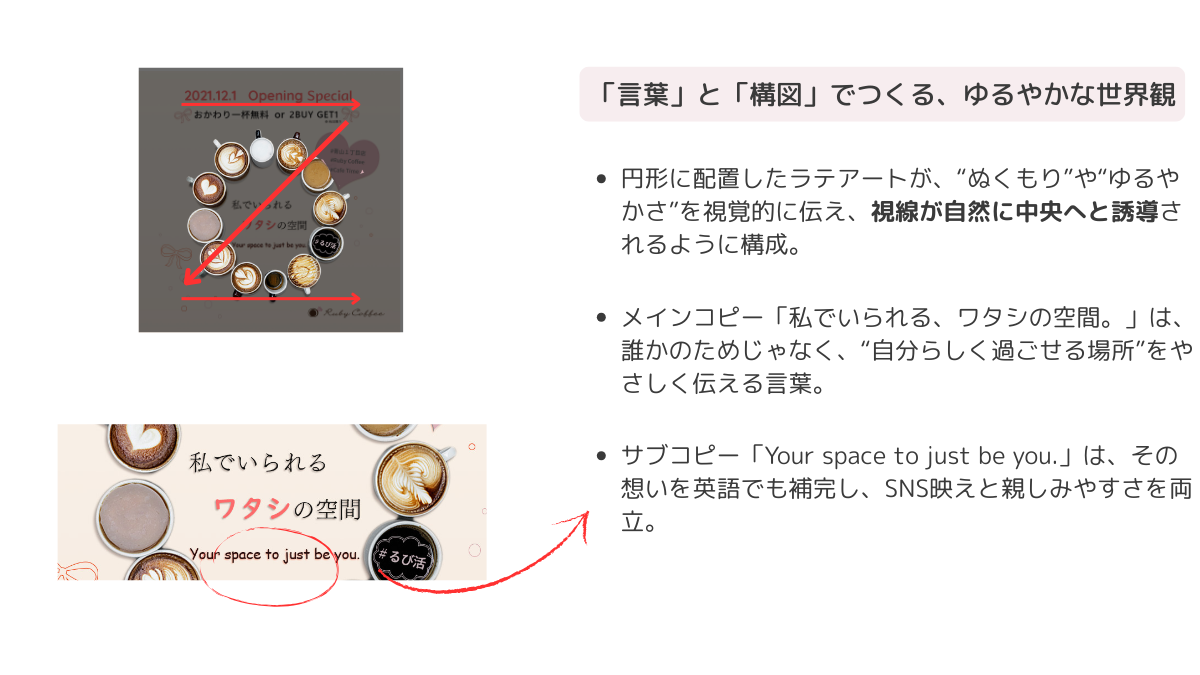 青山一丁目にオープンするカフェ「Ruby Coffee」のInstagramバナーを想定した架空案件です。 トレンド感度の高い女子大生をターゲットに、“自分らしくいられる空間”を やさしい世界観とSNS映えするビジュアルで表現しました。