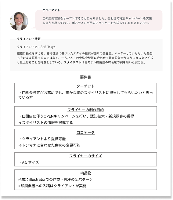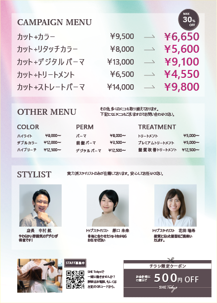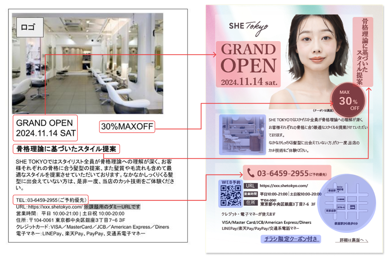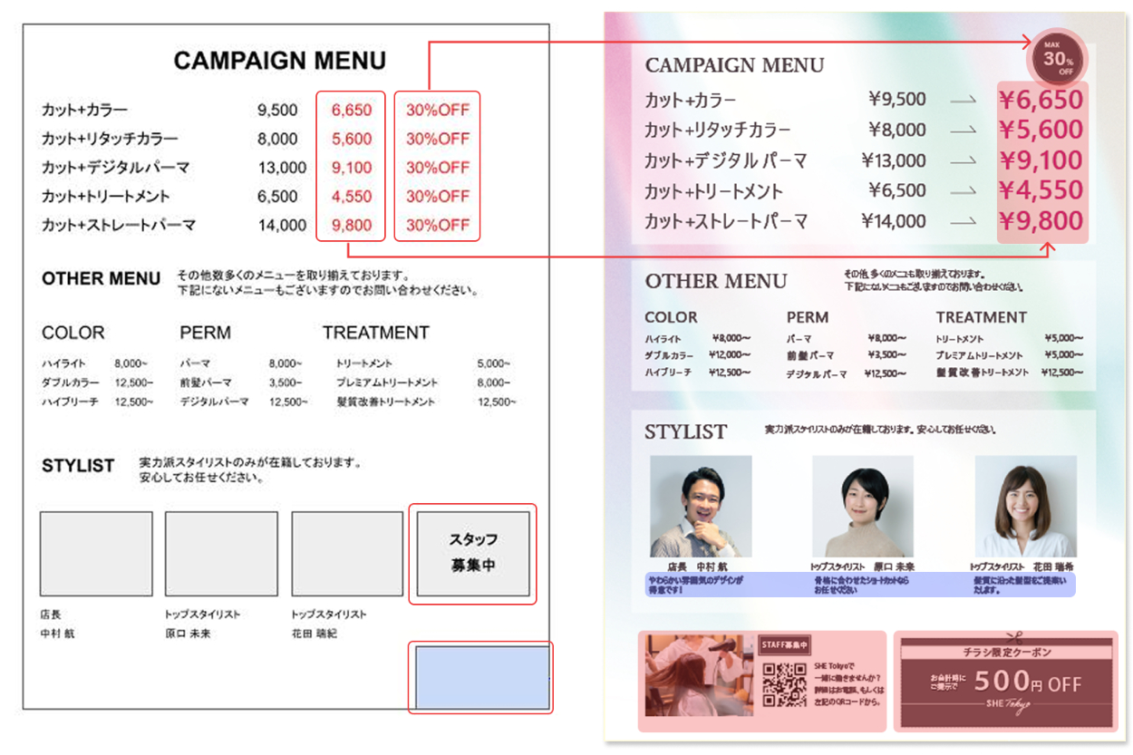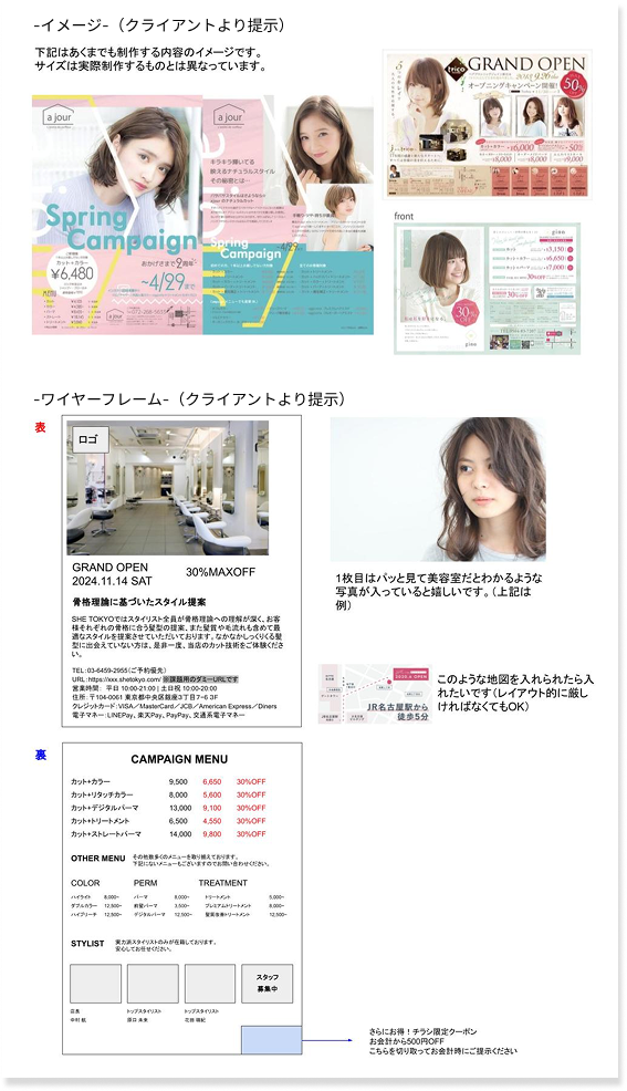 ヘアサロン(仮想店舗)開店に伴い、新規顧客獲得&認知拡大を目的としたフライヤーを制作しました。