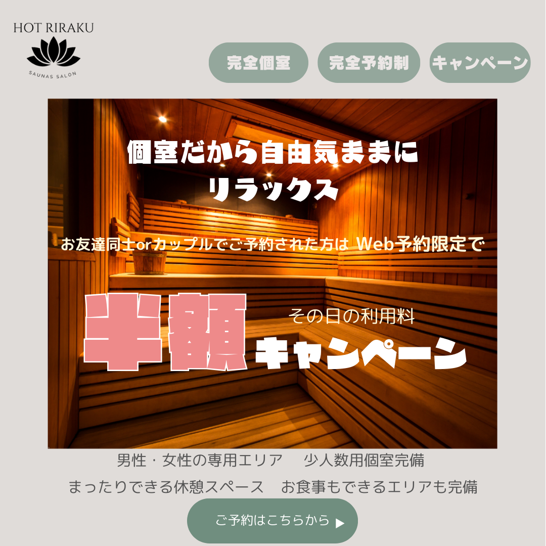 サウナサロン バナー HerTech さとう Webデザイナー 架空のサウナサロンのバナーを作成しました。20~40代の男女、個室のサウナサロン、キャンペーン中という事をふまえ作成しました。少し落ち着いたイメージにしつつ、色味も派手にしすぎず見やすさを考えました。