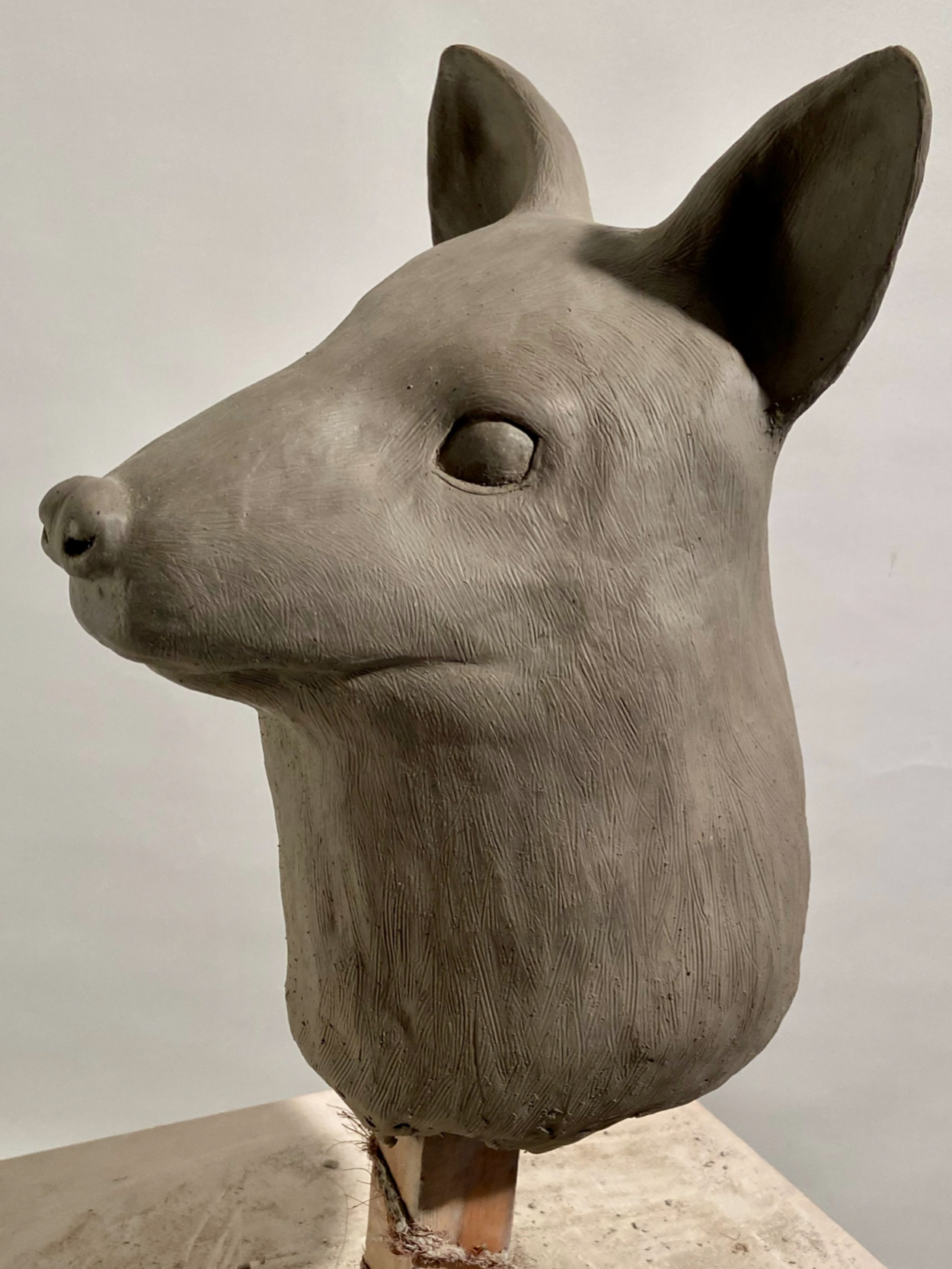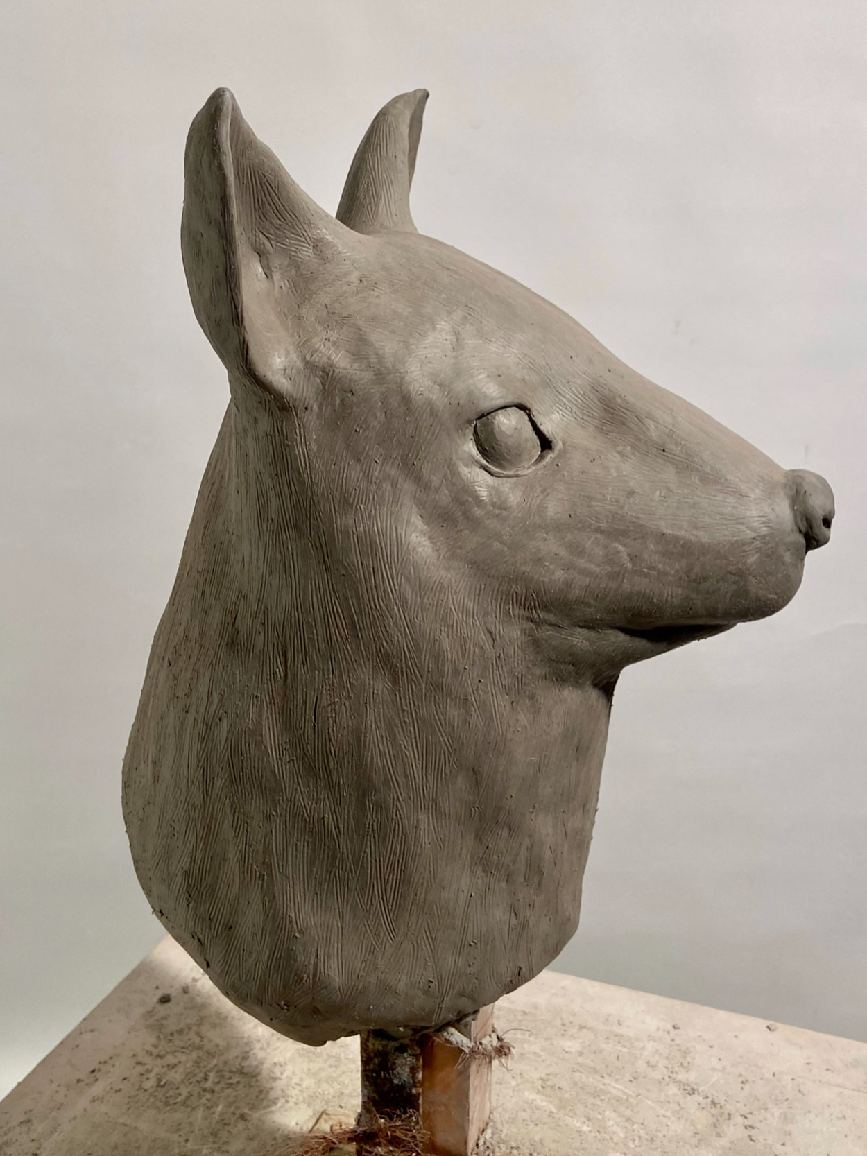 動物首像 (ワラビー) m0ri ayane 専門学生 参考画像や種類によって骨格や肉付きがかなり異なっていたので難しかったです。かわいらしさと凛々しさを表現できるよう目の大きさや骨格に気をつけました。