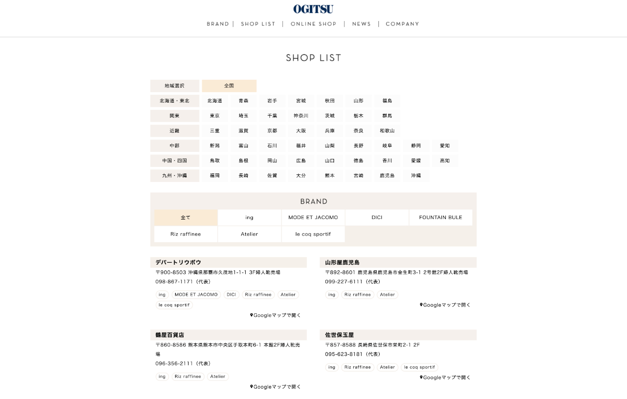 ショップの登録をWordPressの管理画面上で行いたいとのことでしたので、カスタム投稿タイプとカスタムフィールドを使い登録できるようにしました。 フロント面では県とブランド別で絞り込みができるものをjsやphpを使い実装しました。