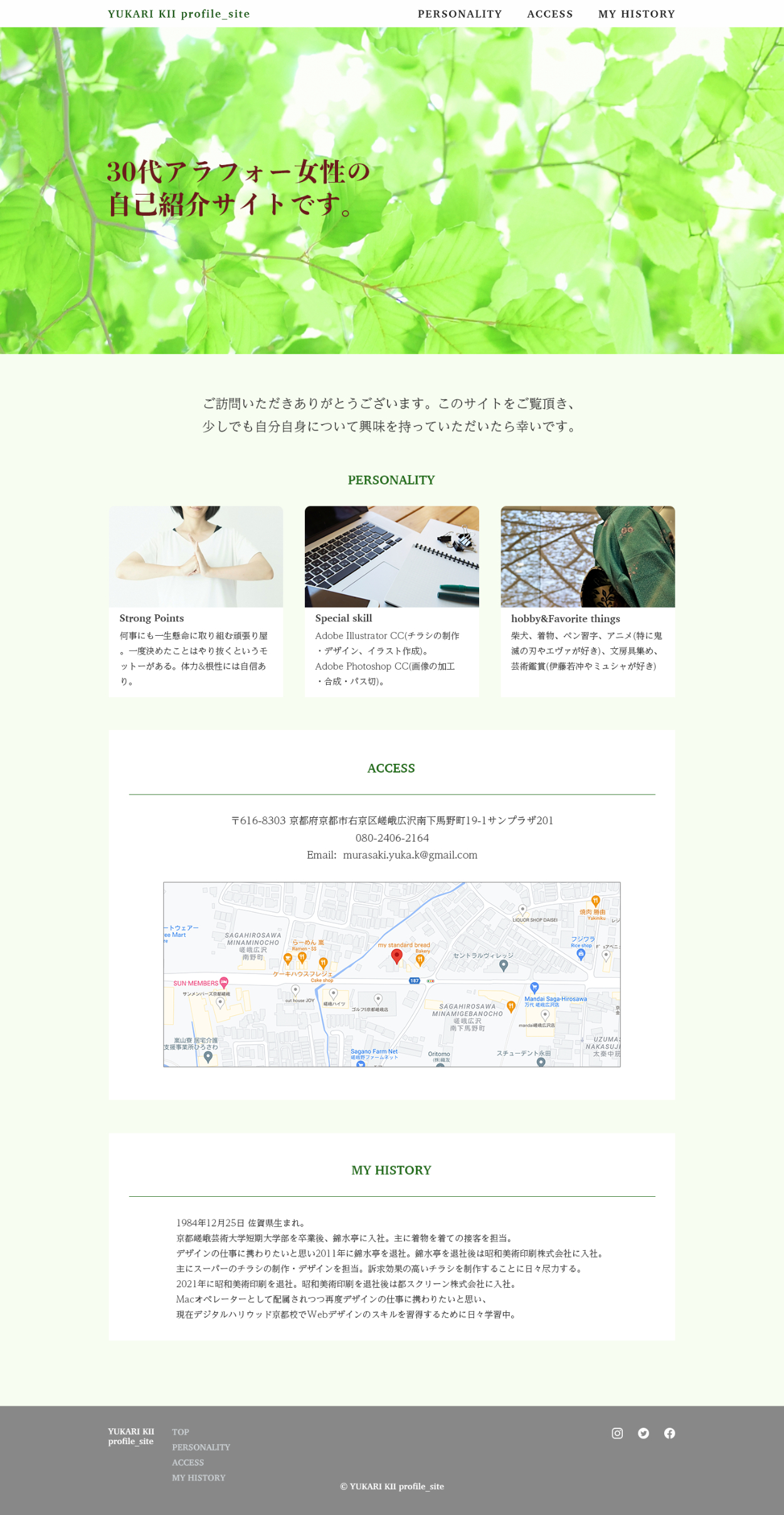 デジタルハリウッドスタジオ京都校での課題で自分自身の自己紹介サイトのデザインをしました。 制作年:2021年8月 制作期間:1週間