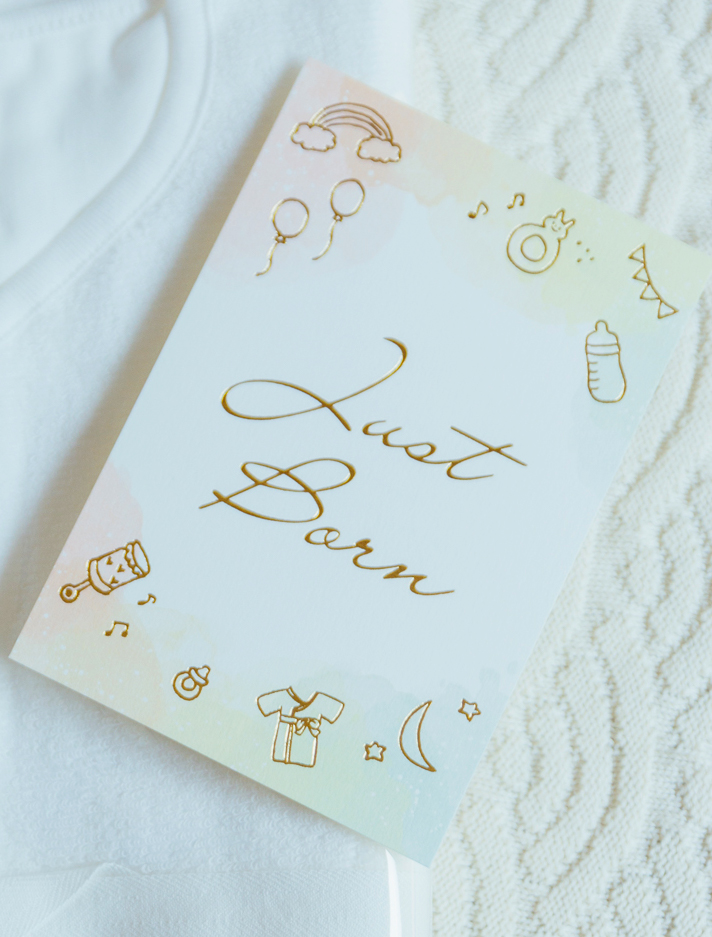 赤ちゃんから連想する手書きイラストと文字は箔押しで、お祝いにぴったりのキラキラ豪華な仕上がりに。生まれてきた赤ちゃんに最強のファーストベビ服を着せて一緒に撮影したくなるようなカードになっています。