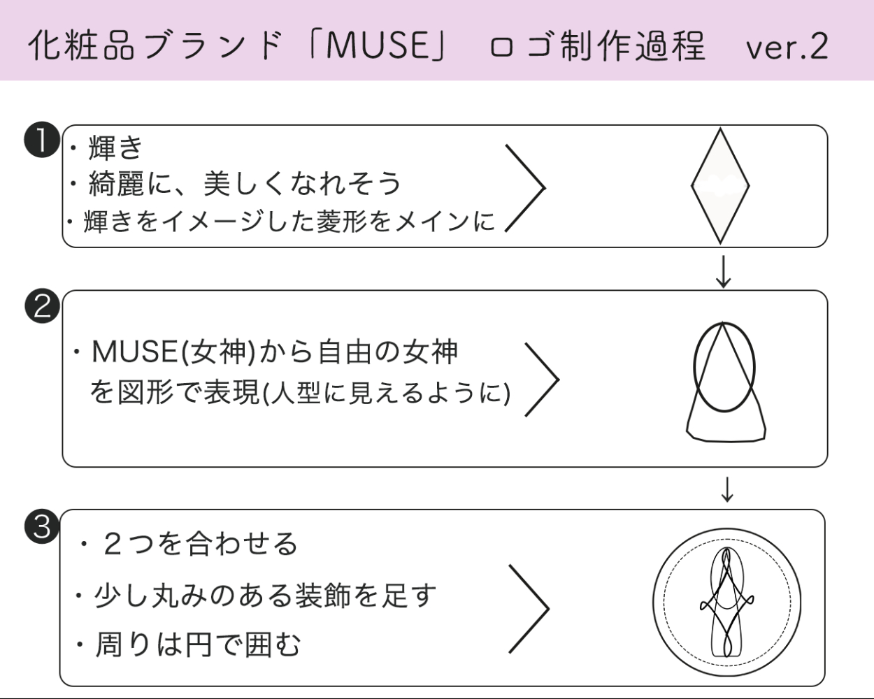 ブランド名「MUSE」の名のように、女神のように、輝いて美しくなれそうというイメージの、高級感のあるブランドをイメージして作成しました。