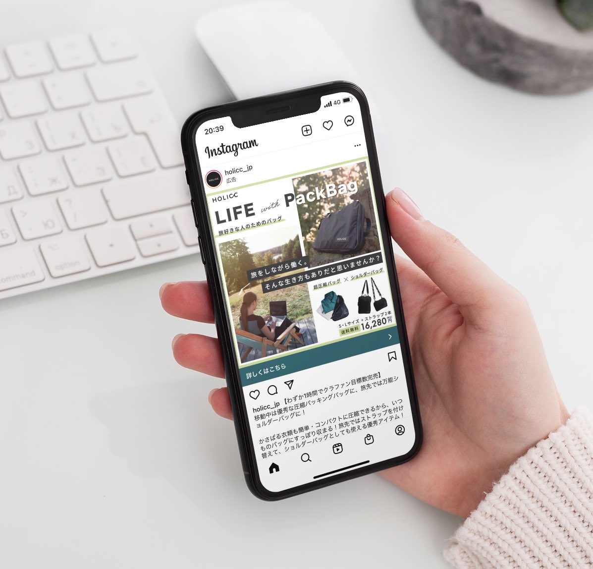 HOLICC様のバッグブランド「PackBag」SNS(FB、インスタグラム)広告用バナーコンペで採用いただきました。