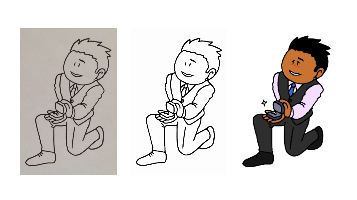 - 当時iPad+Pencilや液タブ等もなかったため、A4用紙にラフ手書き→水性マーカーで清書→スマホで撮影→PCに読み込み→Illustratorで開いて画像トレース→分割拡張→グループ解除→出来上がったシェイプに塗りを指定する という方法で制作