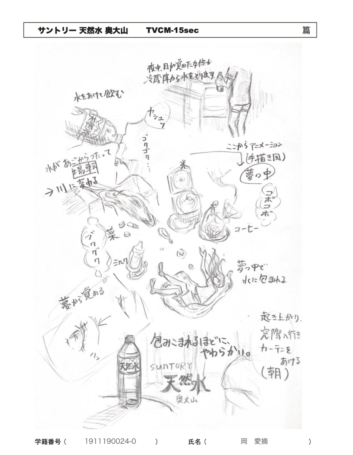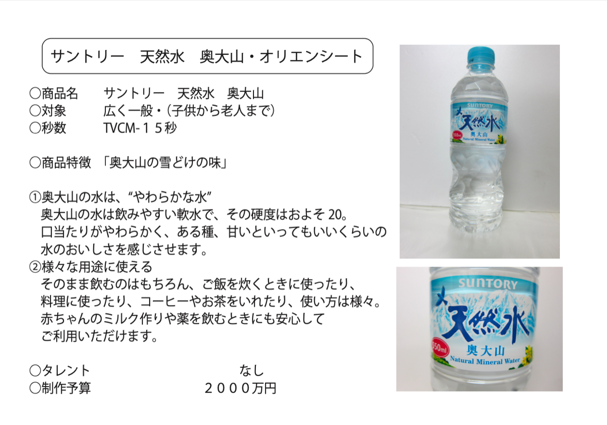 夜中に目が覚めた女性が天然水を飲んでそのやわらかさから夢に落ちていく。商品特徴の一つである「様々な用途に使える」ことを示すため、夢の中でミルクや、炊飯、コーヒーなどを描いている。