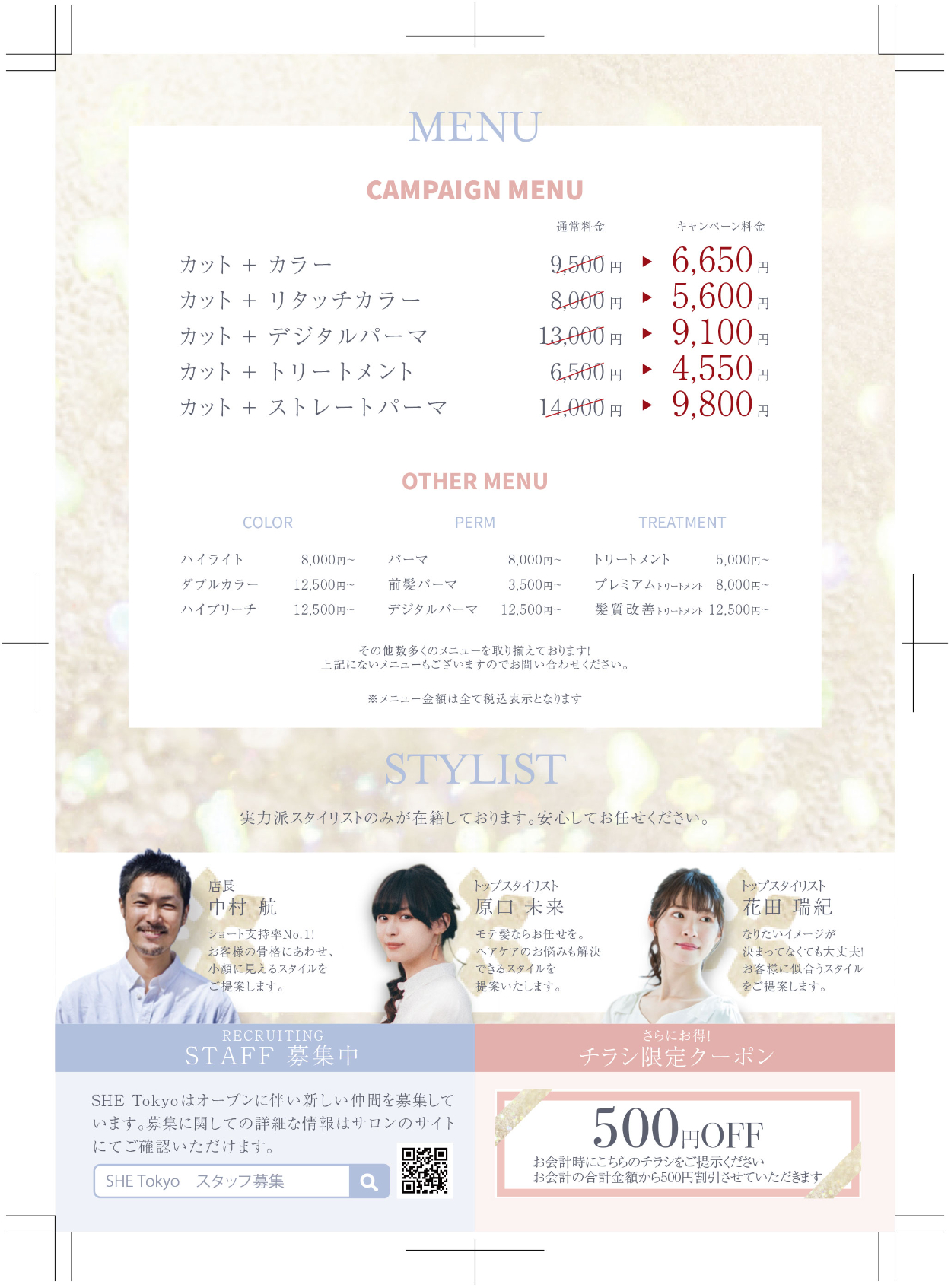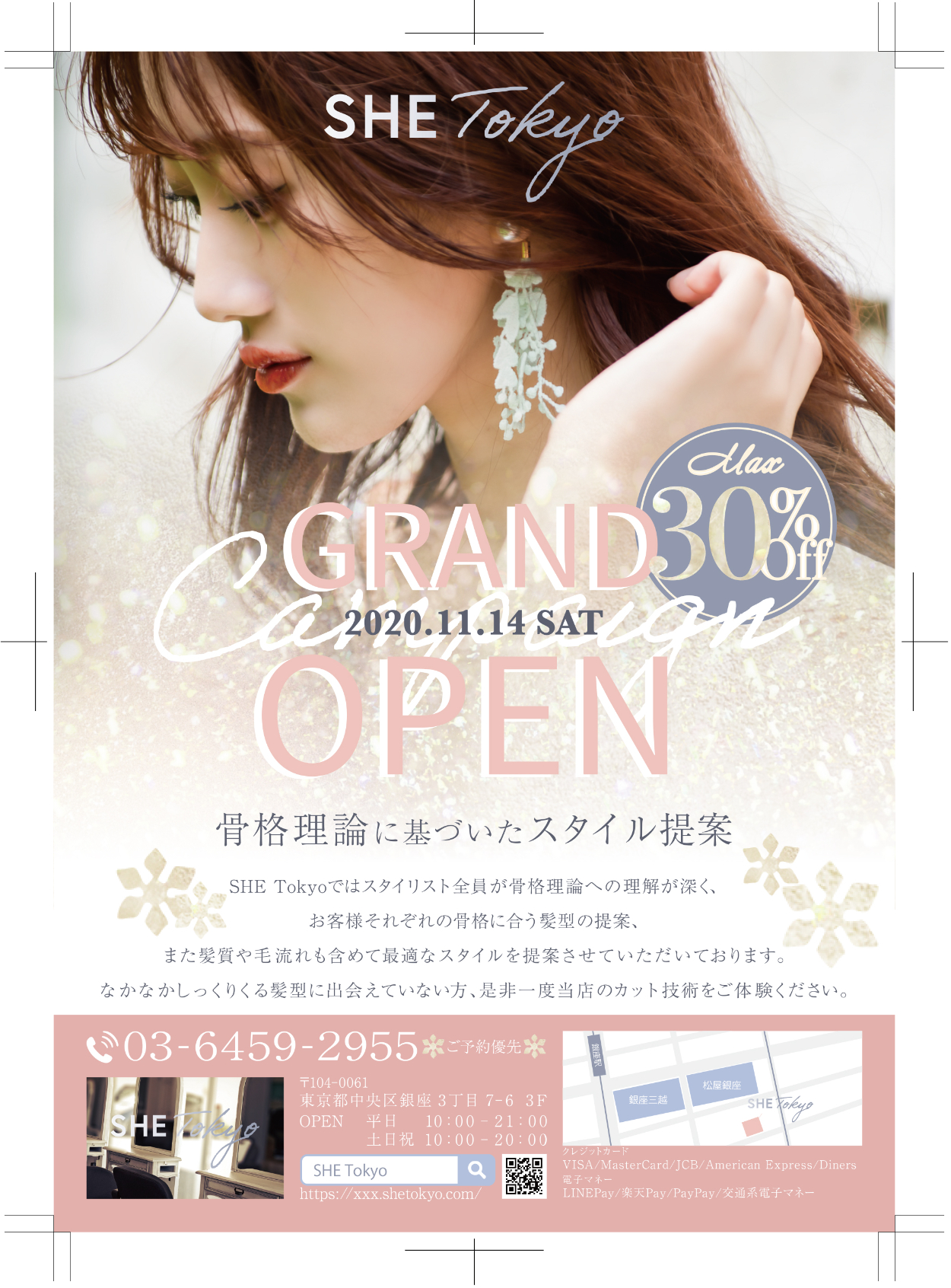 クライアントは銀座に新しくオープンする美容室。オープンに伴い特別キャンペーンを実施。美容室のオープンとそれに併せたキャンペーンを知ってもらい、新規会員獲得のためポスティングで使用するフライヤーを制作して欲しいと考えている。