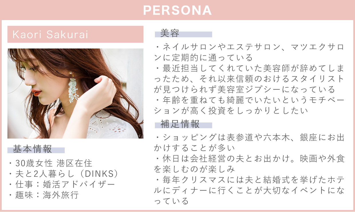 女性であればミレニアル世代(20代後半〜40代)、中でもトレンドや美容に高い関心をもち、自身への投資にしっかりと時間とお金をかけられる女性がメインターゲットと想定した。