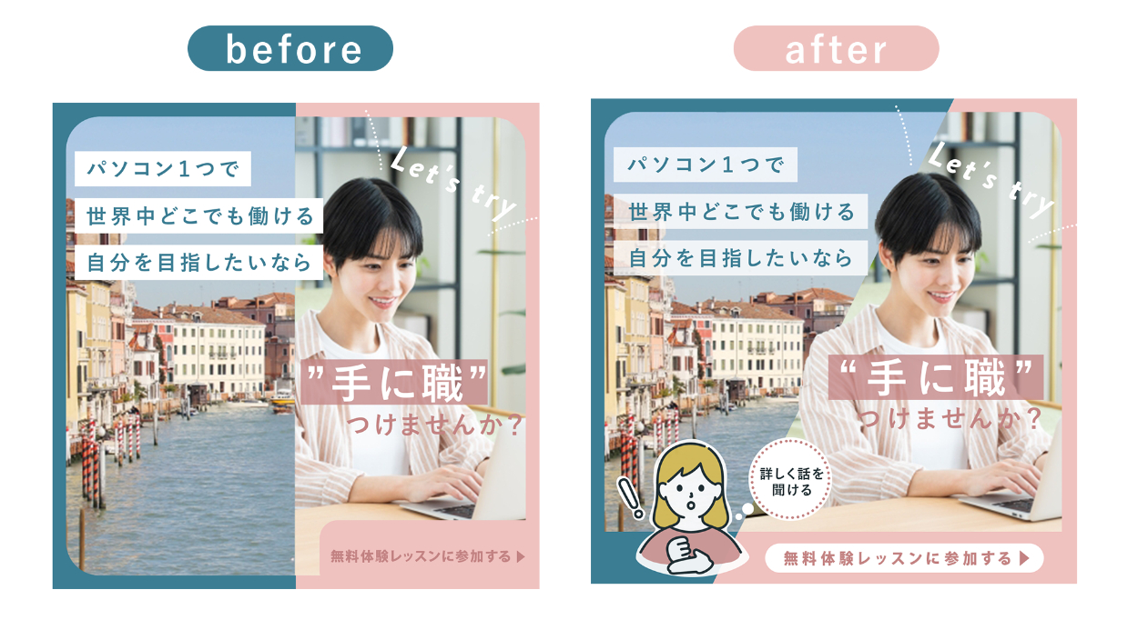 ・今回のテーマがワーケーションだったので、世界旅行をイメージした海外の写真とパソコンを操作しながら笑顔の女性をメインに置き、パッと見た時にワーケーションというのをイメージしやすいようにした。