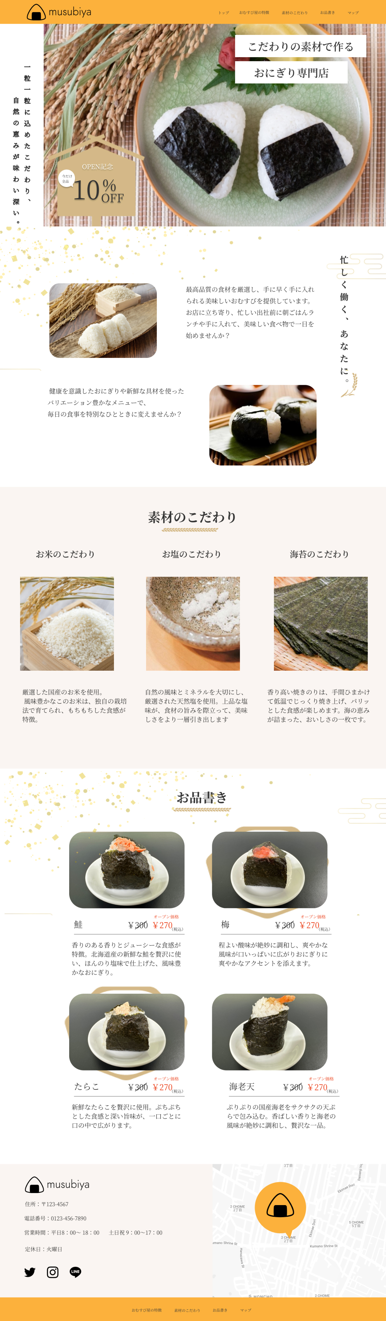 スクール課題でおにぎり屋のLPを制作いたしました。和な雰囲気で品のあるデザインで制作しました。