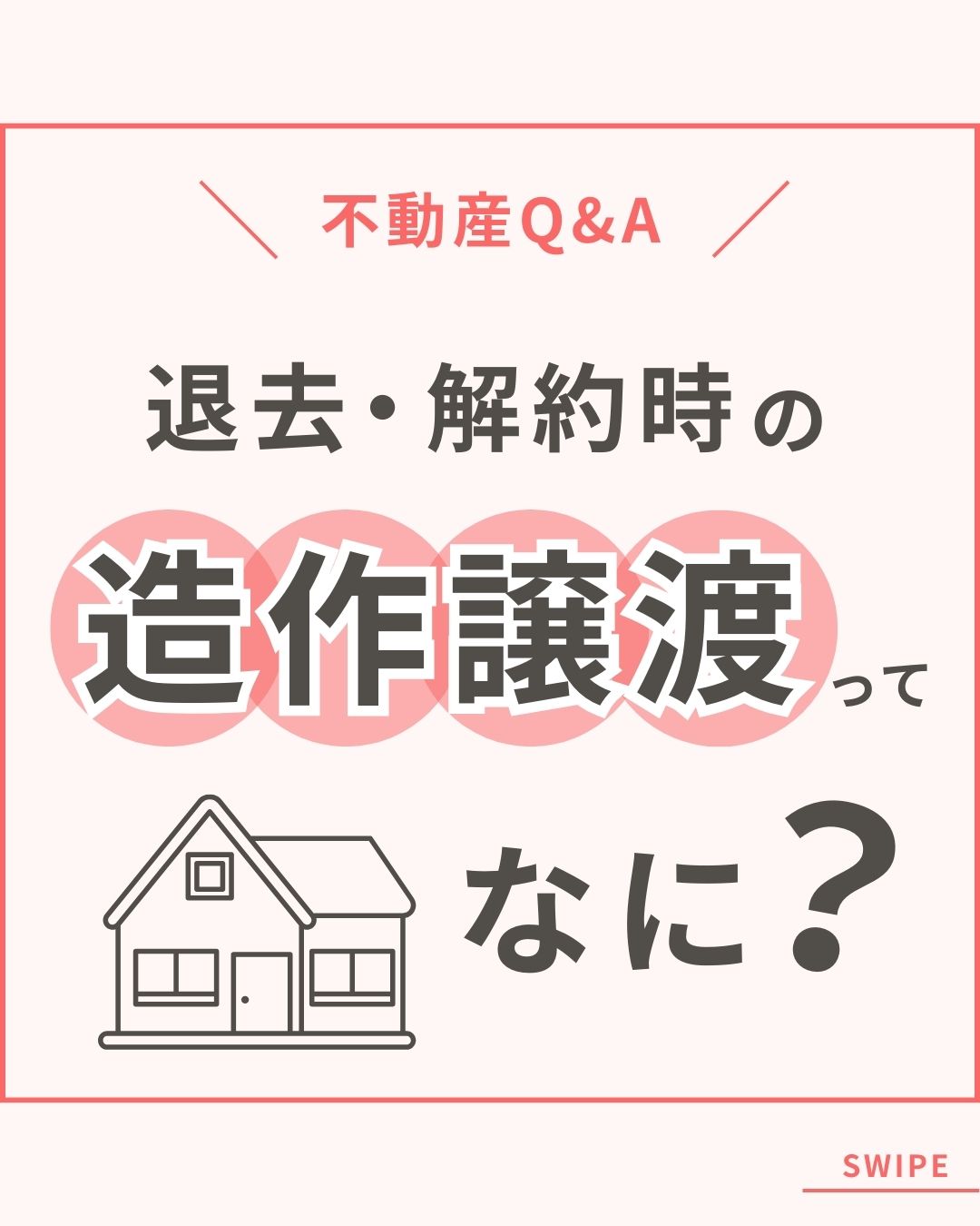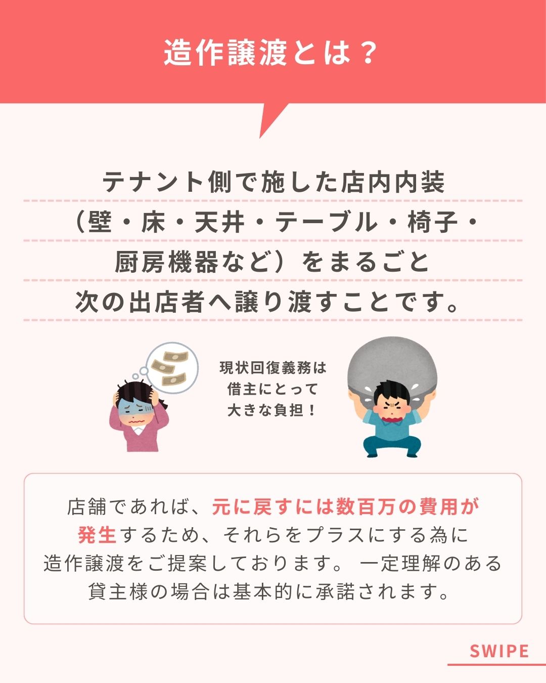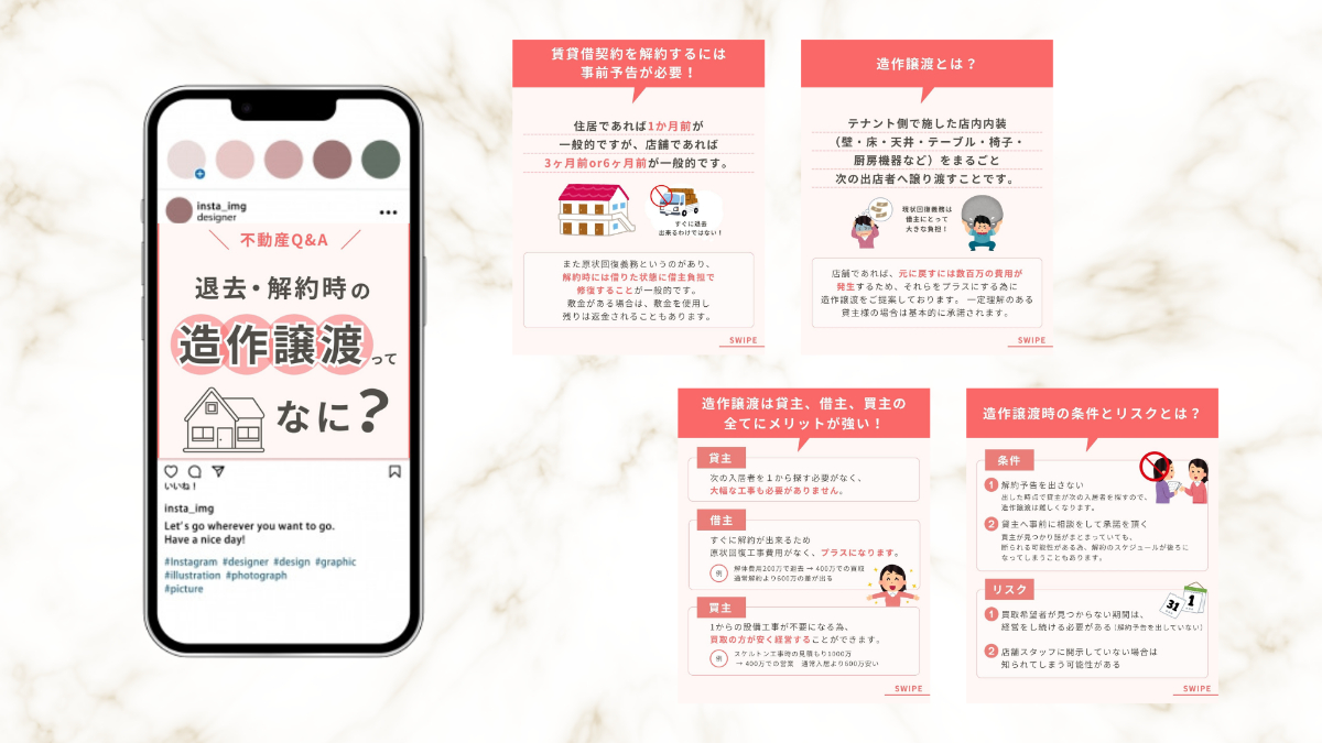 不動産会社様のInstagramでの投稿制作をしました。不動産業界ならではの難しい言葉である、『造作譲渡』をシンプルかつわかりやすい説明になるように、イラスト選定も親しみやすさがでるようなデザインにしました。