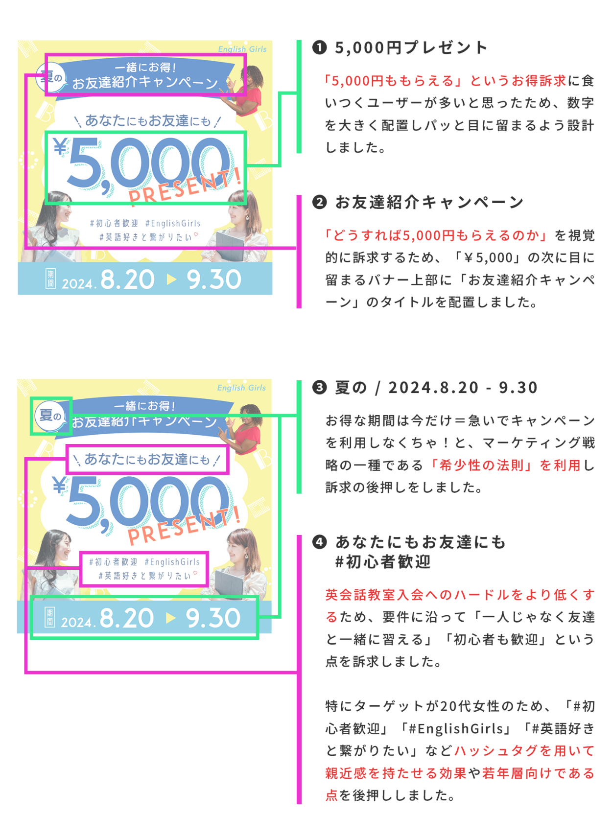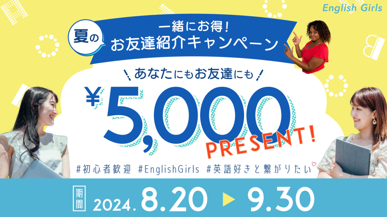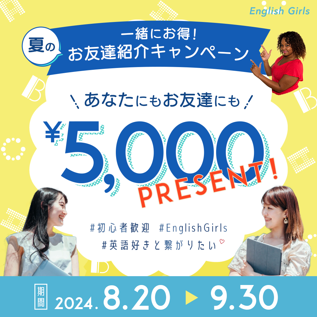「お友達紹介キャンペーン」のタイトルを指さすような外国人女性の写真素材を使用し、英会話訴求&強調効果を狙いました。