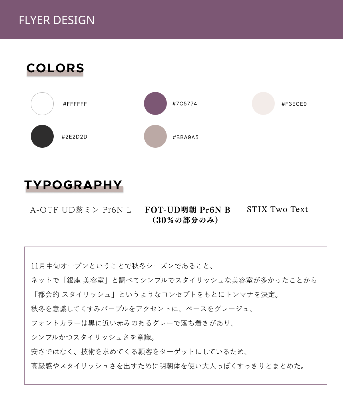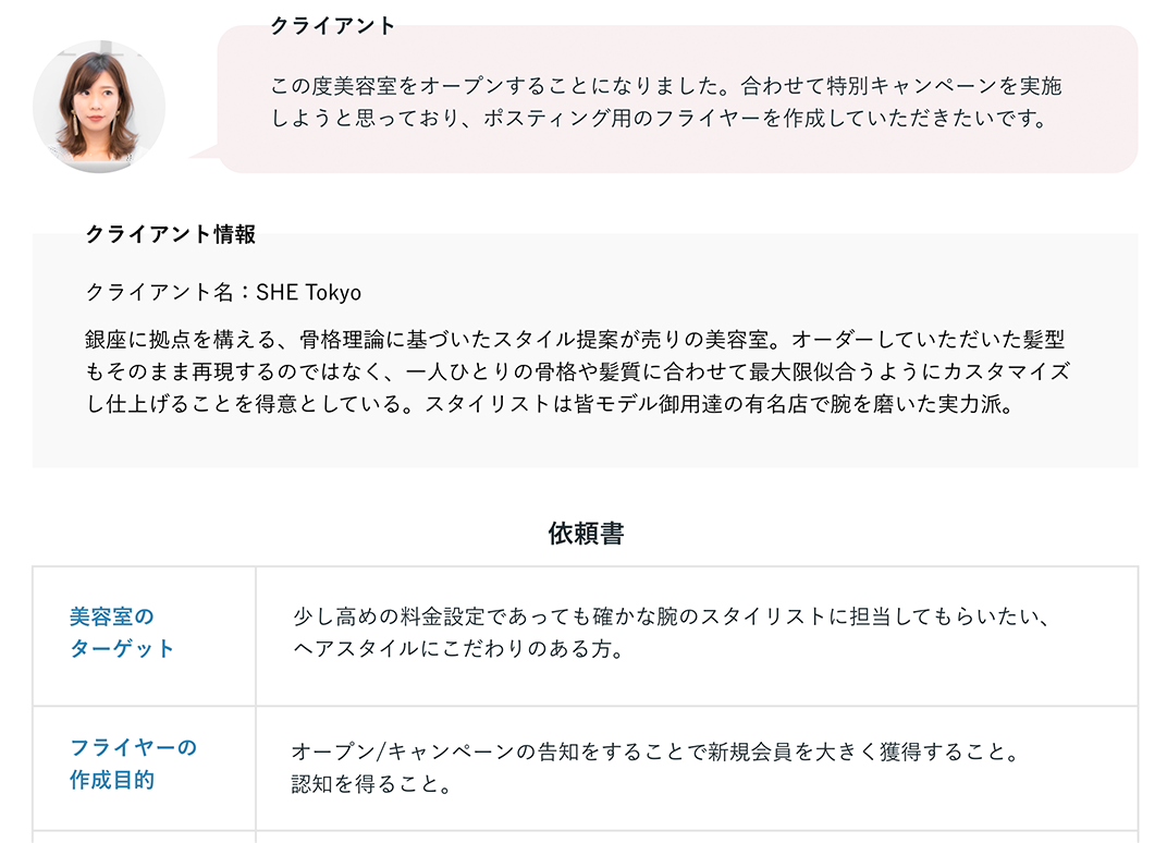 SHElikes【MULTI CREATOR COURSE】の課題にて架空美容室のフライヤー制作に取り組みました。クライアントからの要件書とワイヤーフレームをもとに制作しました。【制作時間:4日(16時間)/使用ツール:Illustrator】