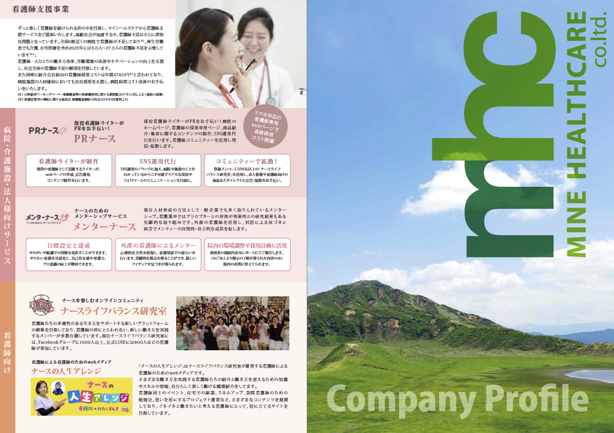 マインヘルスケア様は、看護師コミュニティを活用したPR・教育支援×医療資材開発の2軸展開が魅力。資料デザインでもその「人材と現場に寄り添う姿勢」を可視化し、営業・広報両面で活用いただける構成としました。