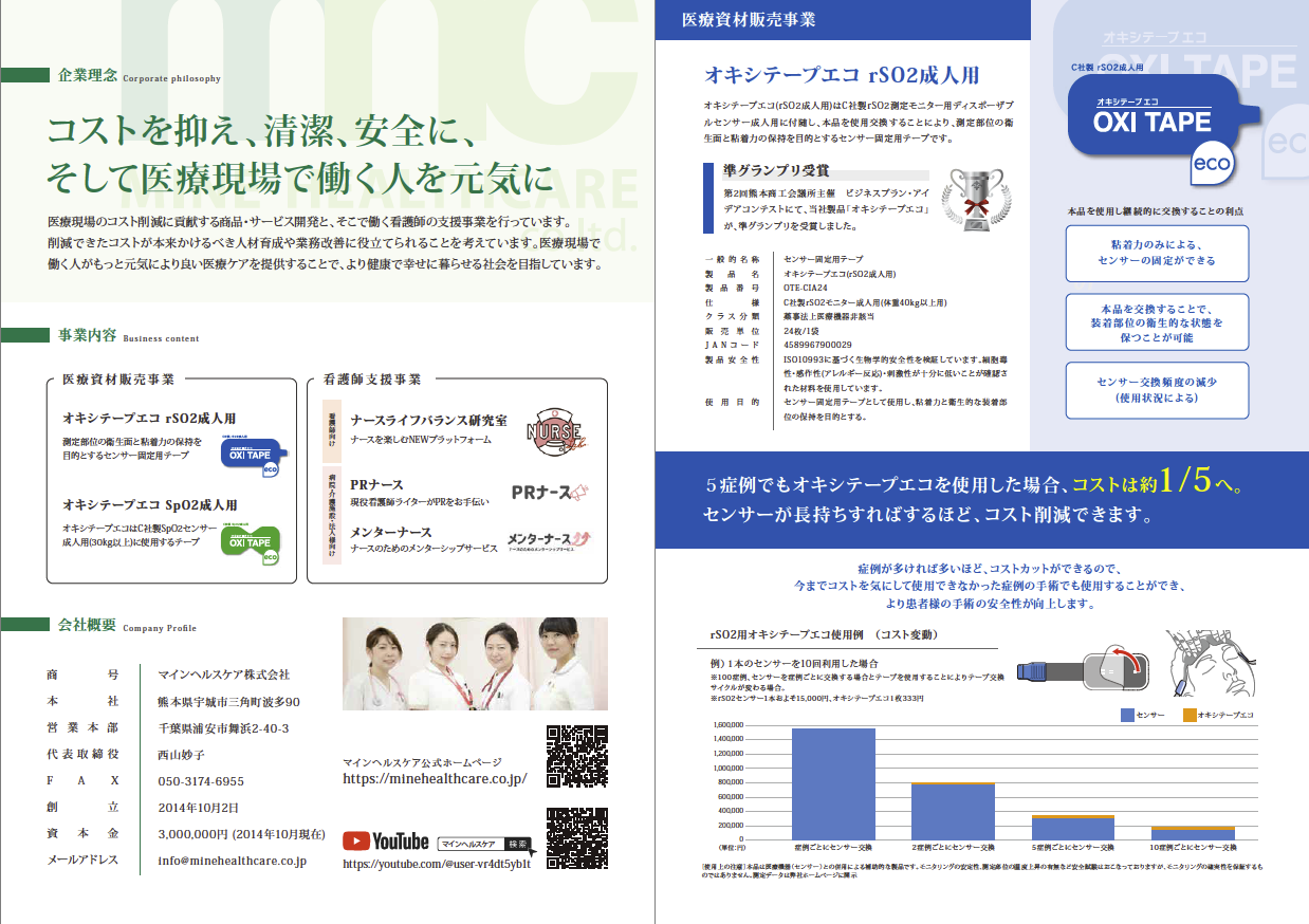 オキシテープエコのコスト削減シミュレーションは、コストインパクトが一目で伝わるよう工夫。現役看護師による支援サービスの多様性を整理し、
