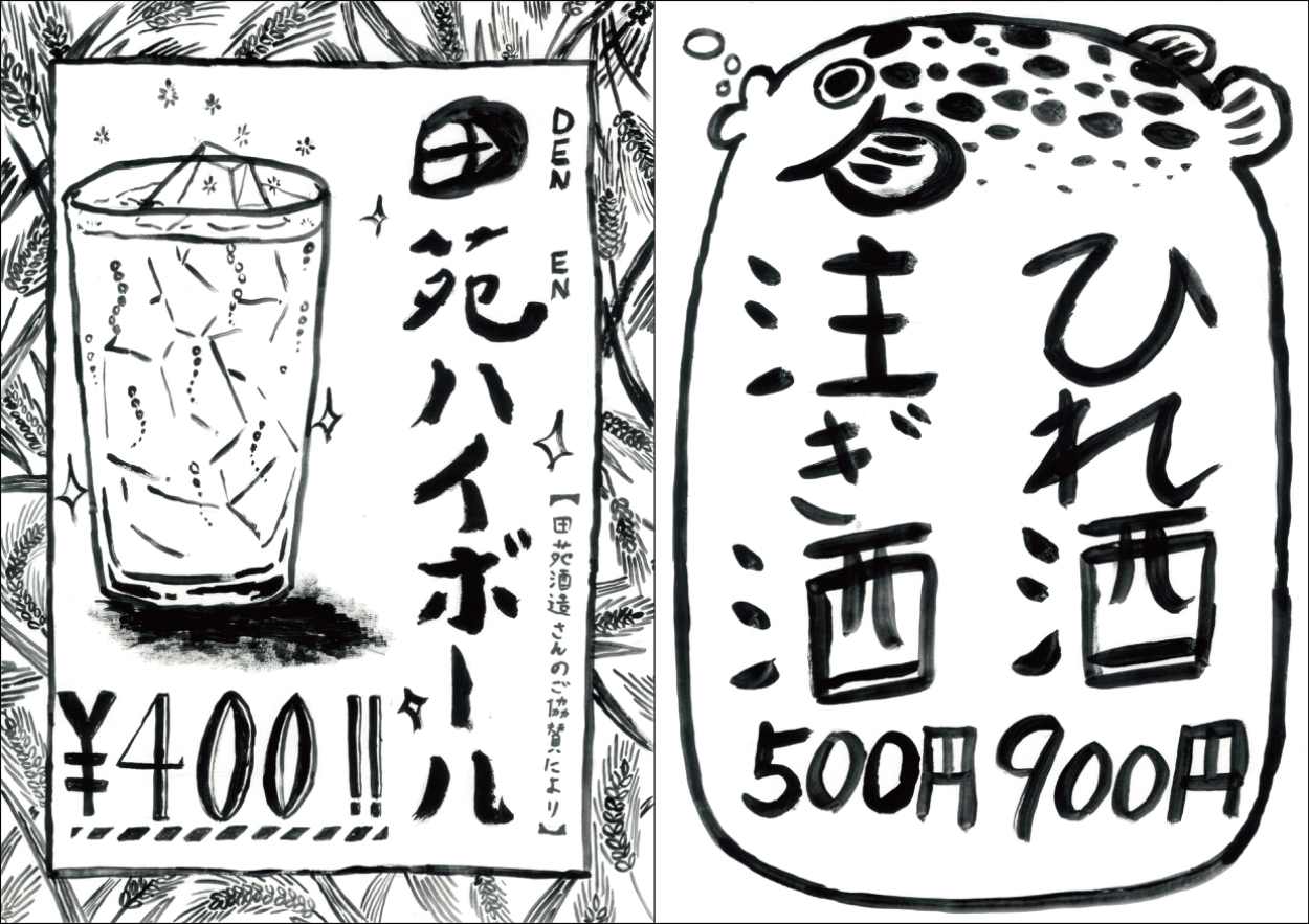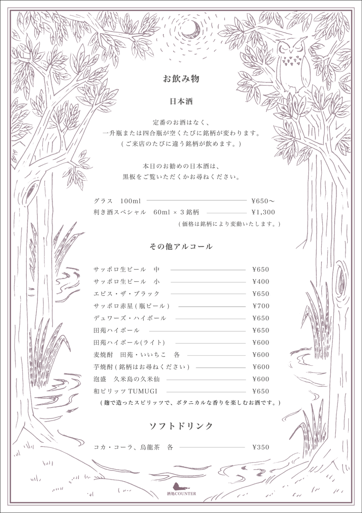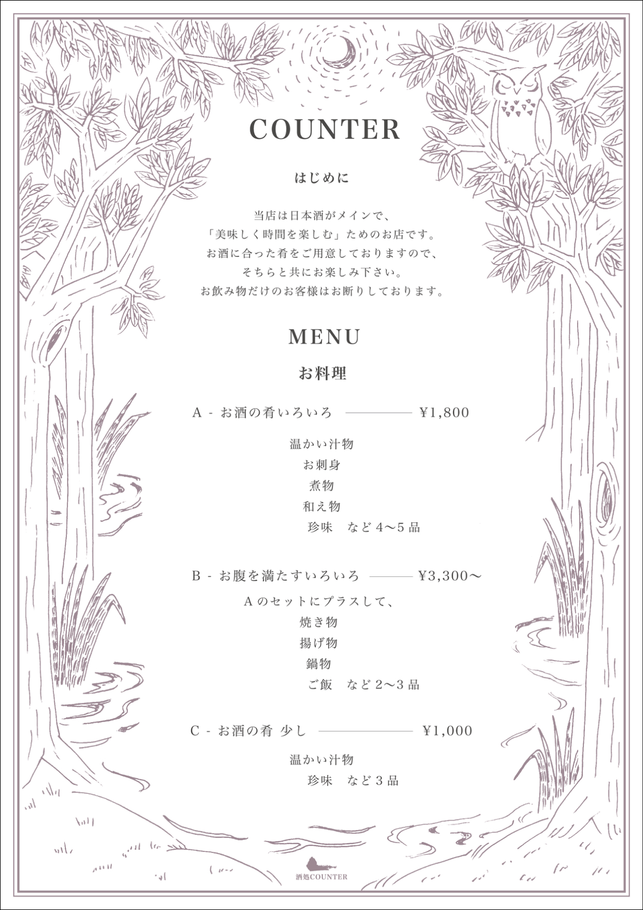 薄暗い落ち着いた店内で静かに飲むお店というイメージがあり、月明かりの中で上手い肴で上手い酒を楽しむイメージでメニュー表からそういう雰囲気を感じとってもらえたらと思いデザインした。