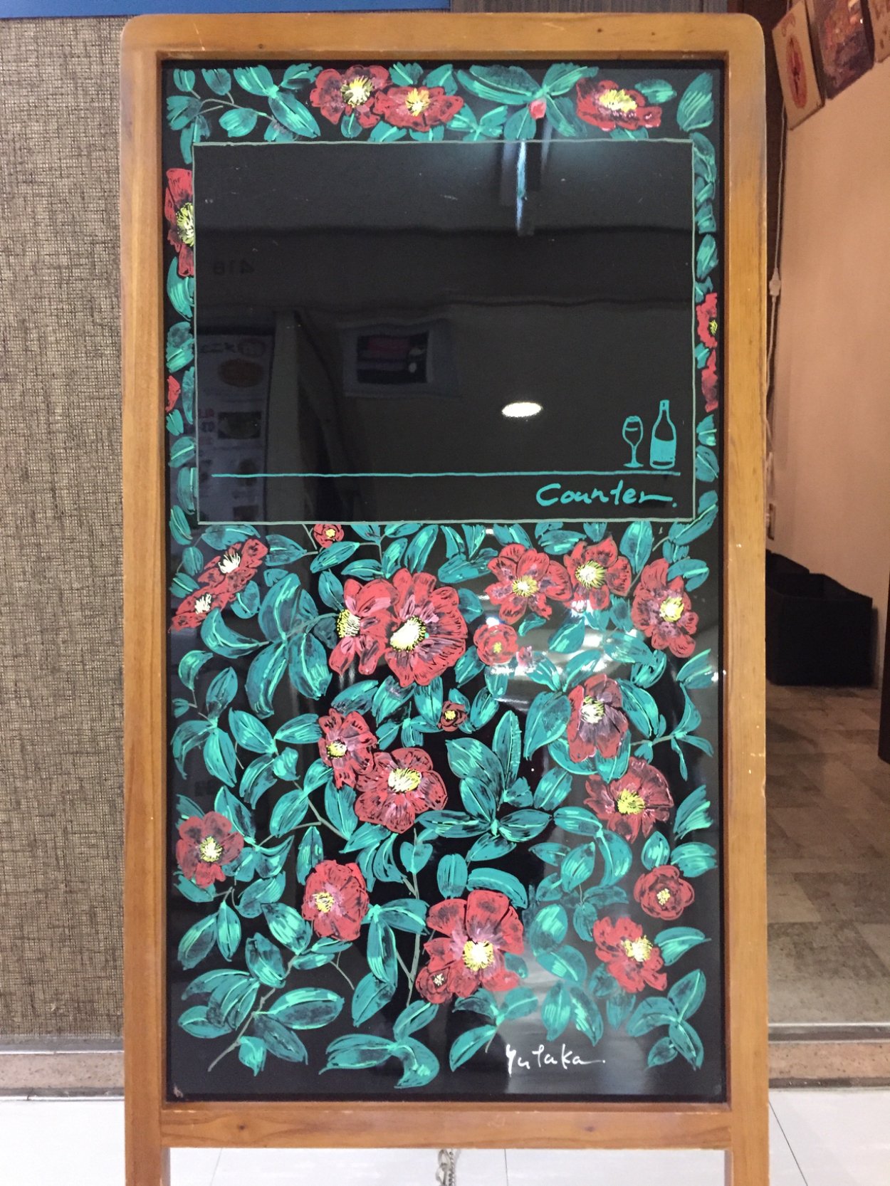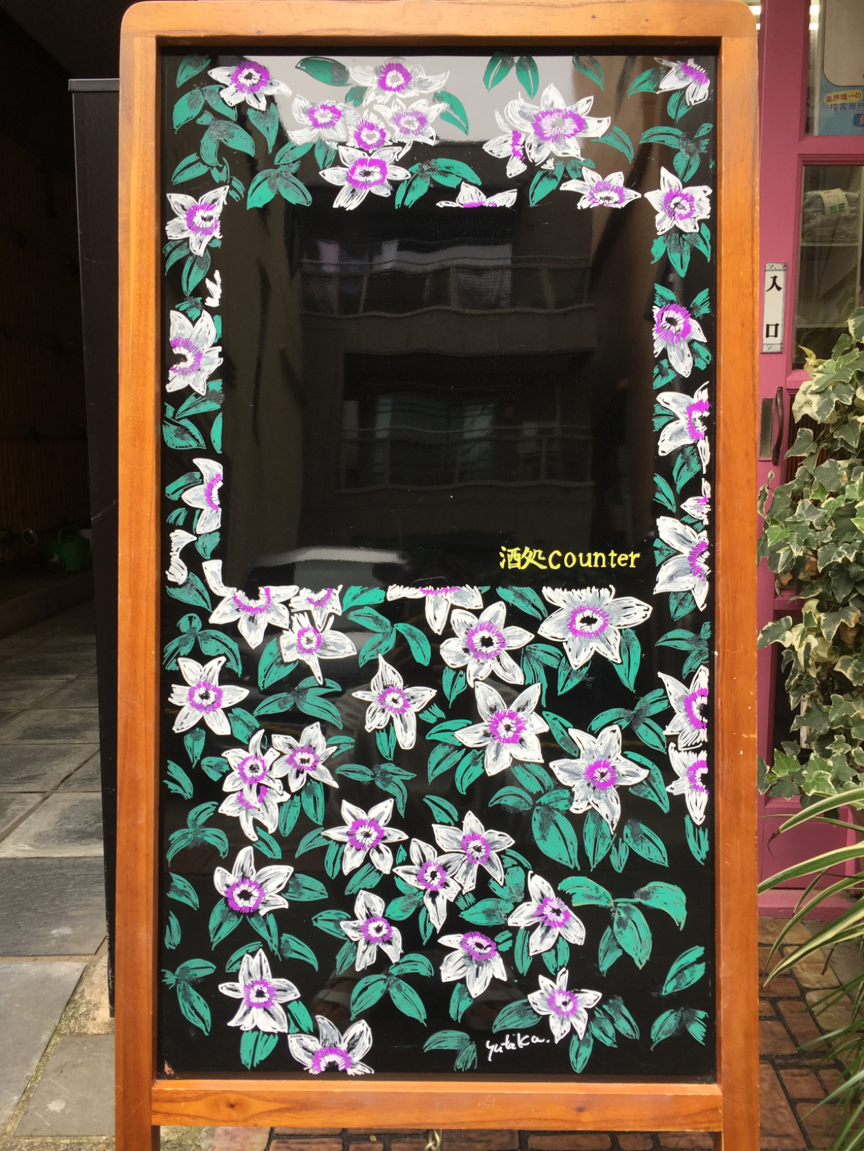 本日のお酒の銘柄を書いたりするための立看板を華やかに見せたいので「花を描いてほしい」と店主の要望を受け、文字を書くスペースを確保しつつ店主の好きな花をイラストで描き通る人の目を引くよう制作した。