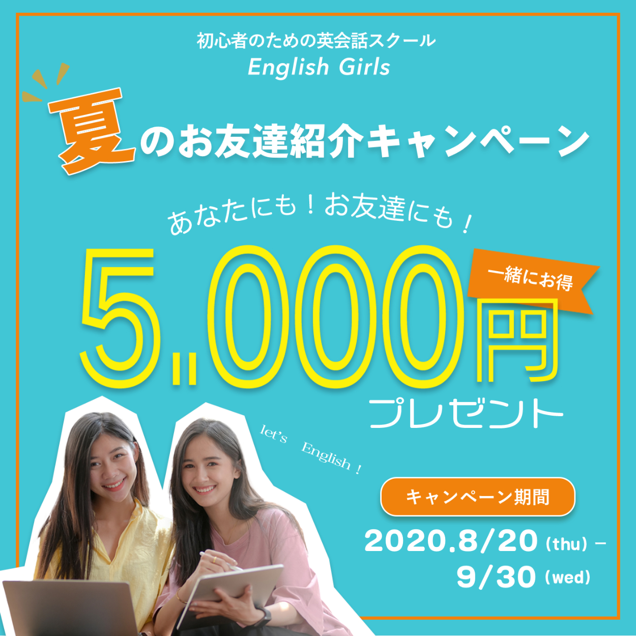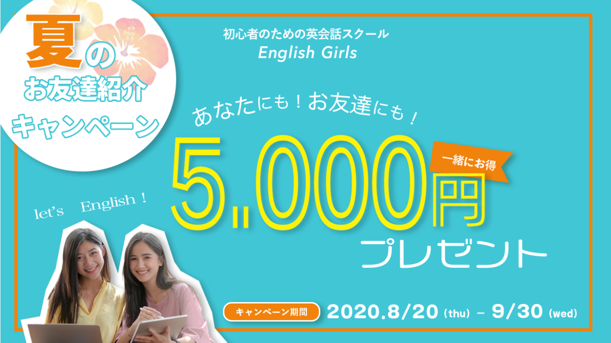 ①一緒にお得!②夏のお友達紹介キャンペーン③あなたにもお友達にも5,000円プレゼント④期間:2020年8月20日〜9月30日