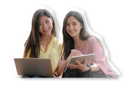 夏らしく爽やかな服装の二人の女性が、笑顔で楽しそうにしている写真を選びました。