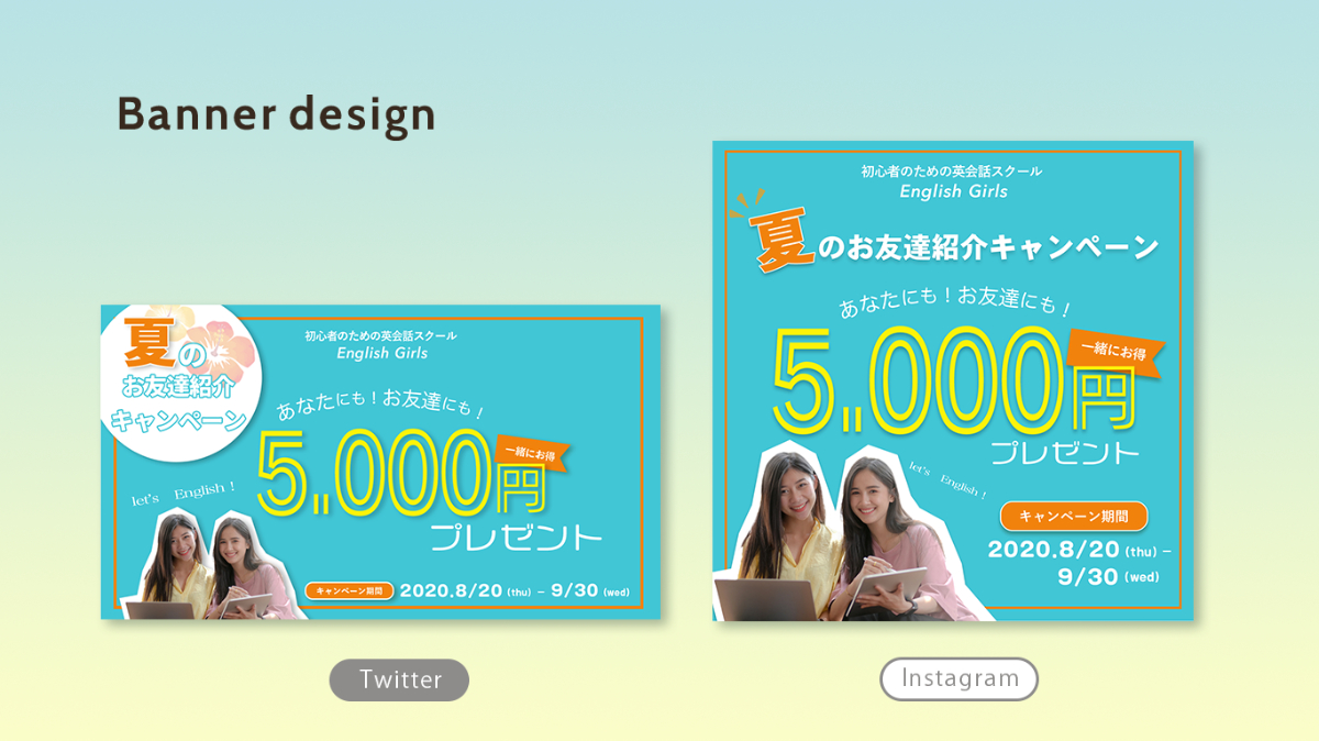 SHElikes MULTI CREATOR COURSEの課題で、初めてのバナー制作に取組みました。20代女性をメイン顧客とする英会話教室のバナーです。目的はキャンペーン利用での入会者を増やすことです。(制作時間:17時間)