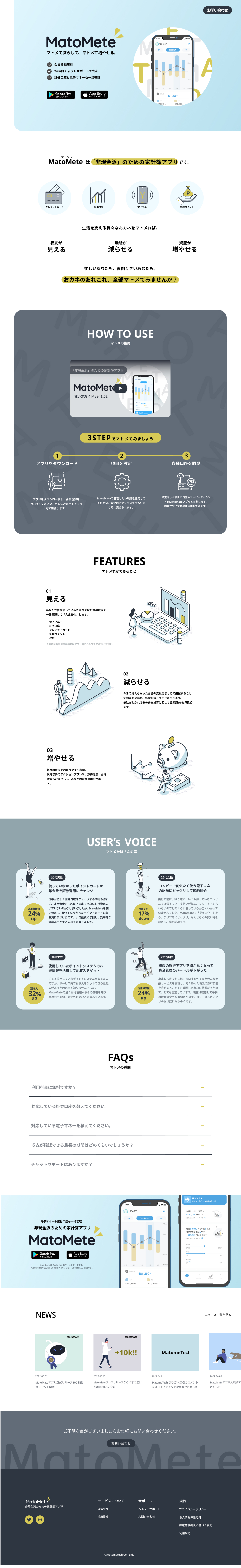 20代〜30代の社会人をターゲットとした家計簿アプリのLPである。 シンプルかつ直感的な操作感を売りにしており、装飾のシンプルさと余白で表現した。 先進的なテック系企業という点を寒色系の色彩で表現し、アプリの親しみやすさを彩度とアクセントカラーで表現した。