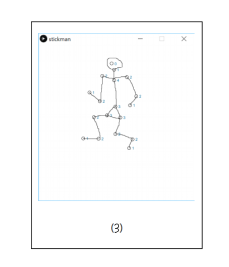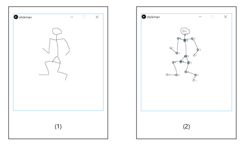 (1)の画像は 18 本で描かれた棒人間で、これが入力情報となる。これに対してストロークの両端にノードの表示を行っているのが(2)である。