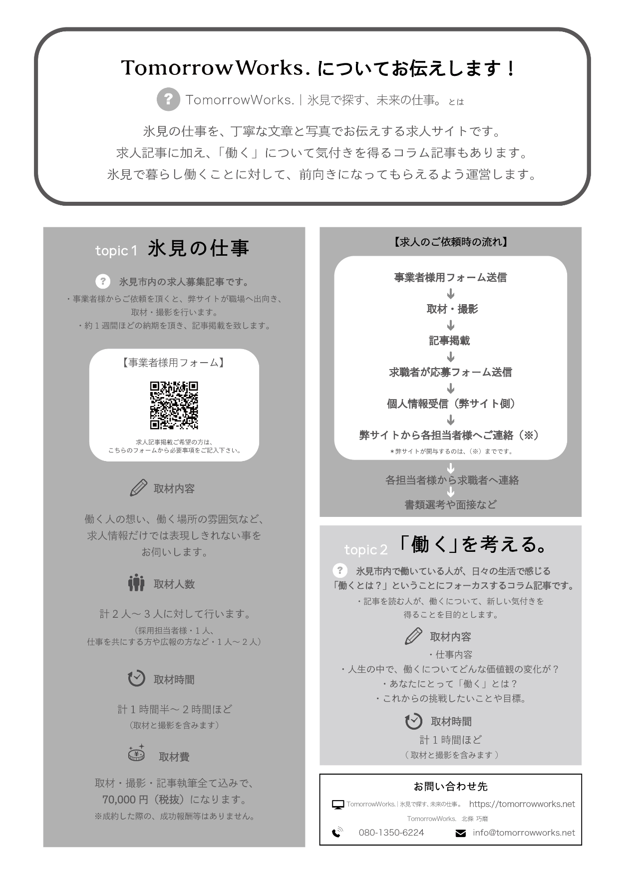 富山県氷見市の求人サイトTomorrowWorks.の紹介A4フライヤーです。