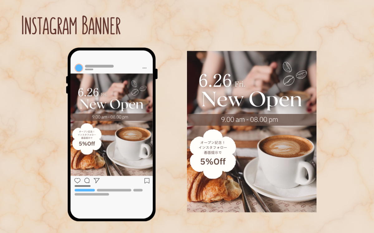 オープン記念キャンペーン(フォローで5%OFF)を訴求し、Instagramのフォロワー増加と来店につなげることを目的としました。