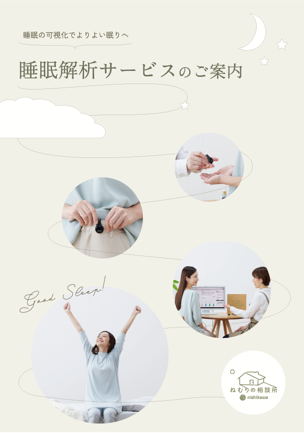 大手寝具メーカー西川株式会社様が展開する「ねむりの相談所」にて、睡眠解析サービスをご利用されるお客様にお渡しするシートをデザインしました。 クライアント様のご協力により表紙のみ掲載させていただいております。