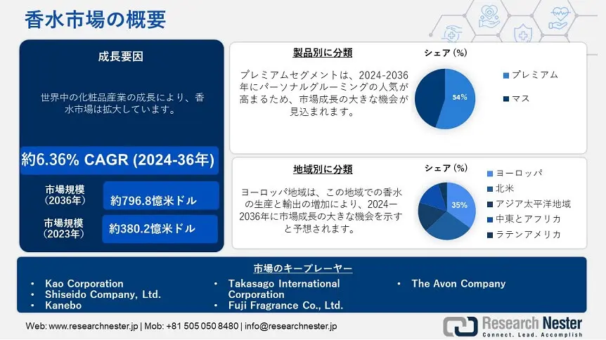 香水市場規模は、2036年末までに796.8億米ドルに達する見込みです。2024 – 2036 年の予測期間中に 6.36% の CAGR で成長します。 2023 年に香水業界規模は 380.2 億米ドルがありました。 香水市場は、世界中の化粧品部門の拡大により繁栄しています。 日本の香水市場は、2024―2036年の予測期間中に大きなシェアを占めると予測されています。 この成長は、国内の美容・化粧品部門の成長によるものと考えられます。 有名人の推薦はブランドと顧客の間の関係を促進し、有名人以外の推薦と比較して、より好意的な反応を引き出し、香水の購入傾向を高めることができます。