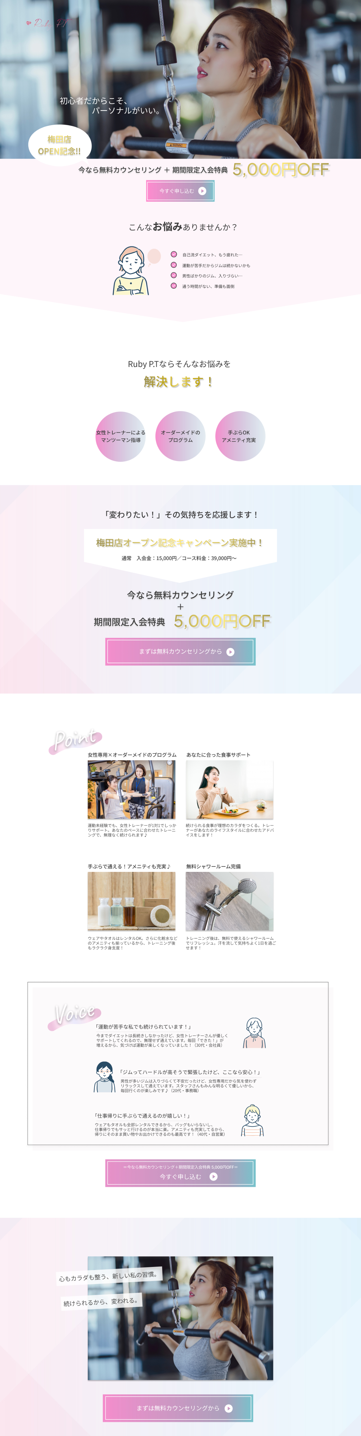 目的:女性専用のパーソナルトレーニングジムです。 運動・ダイエットしたいけれど、何から初めていいかわからない・・・といった運動初心者の方に多く利用いただいています。 このたび梅田に新店舗をオープンするので、無料カウンセリング受付中告知のLP作成をお願いいたします。 Instagram広告、GDNバナー広告、リスティング広告を打つ予定です。