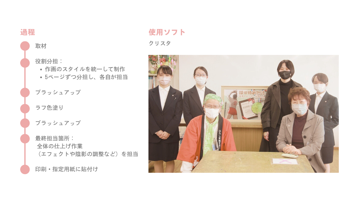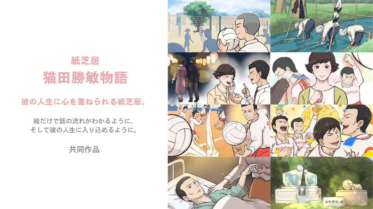 かつて日本バレーを世界の頂点に導いた、“世界一の名セッター”猫田勝敏氏の功績を伝える紙芝居プロジェクトに参加しました。 イラスト制作の一部を担当し、歴史的な場面の再現や登場人物の表情、色味の調整など、見る人に伝わりやすく印象に残るよう丁寧に仕上げました。