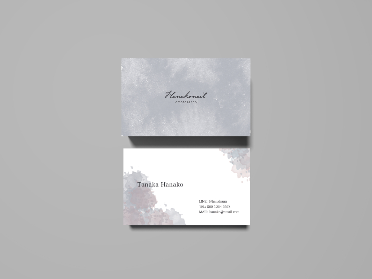 架空のネイルサロンの名刺 honoka 株式会社エピシャルム(WEBデザイン等) OVERVIEW 落ち着きのある女性らしい名刺 【テーマ】落ち着きのある女性らしいネイリストの名刺【こだわった点】・落ち着いた雰囲気を出すためにくすみ感のある色合いに・名前の部分はくすみブルーだけではなくくすみピンクを混ぜて女性らしさを