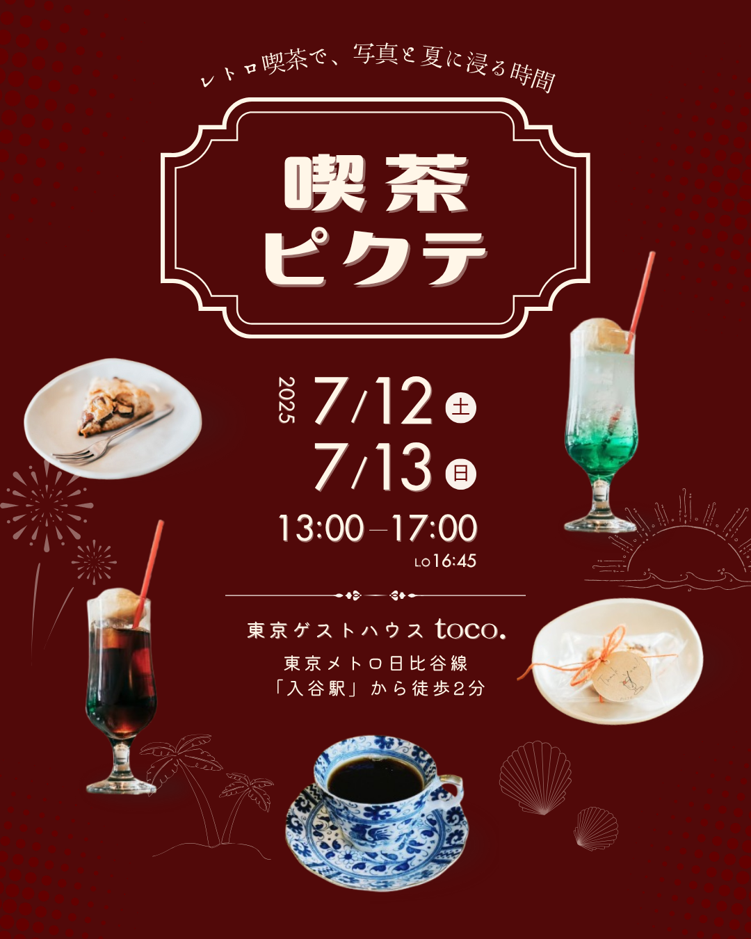 - 同時開催される写真展では「夏展」という夏をテーマにした展示を企画されていたため、雰囲気がマッチするよう、花火やヤシの木、貝殻など夏を連想する素材を散りばめました。