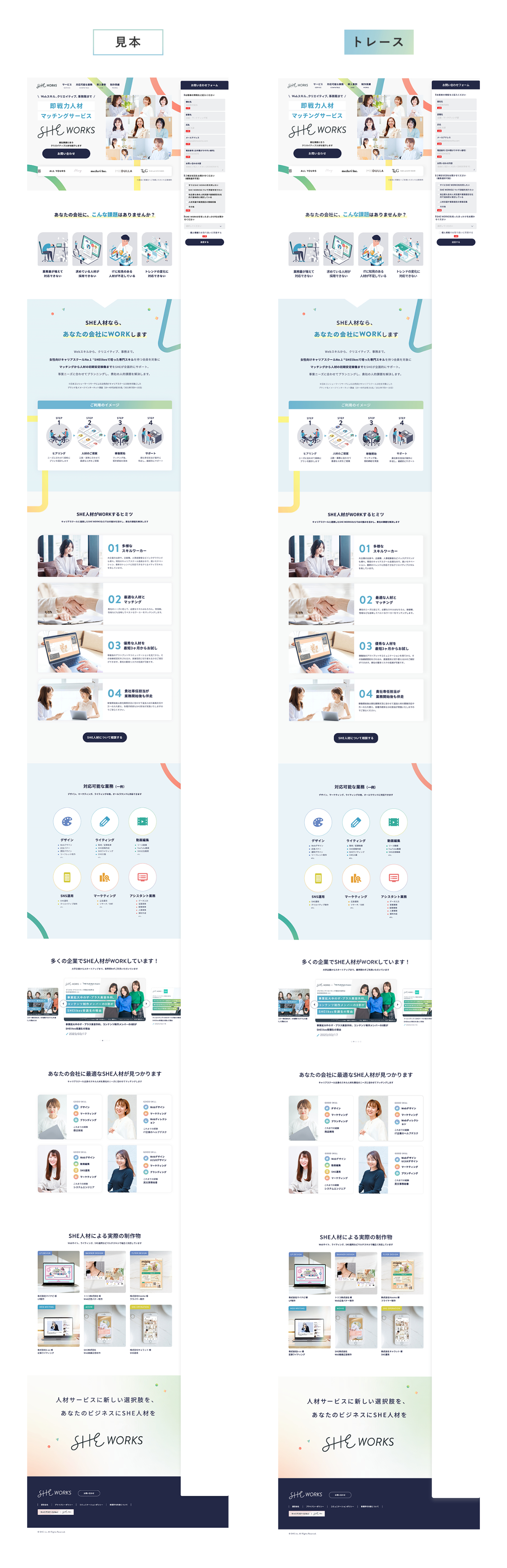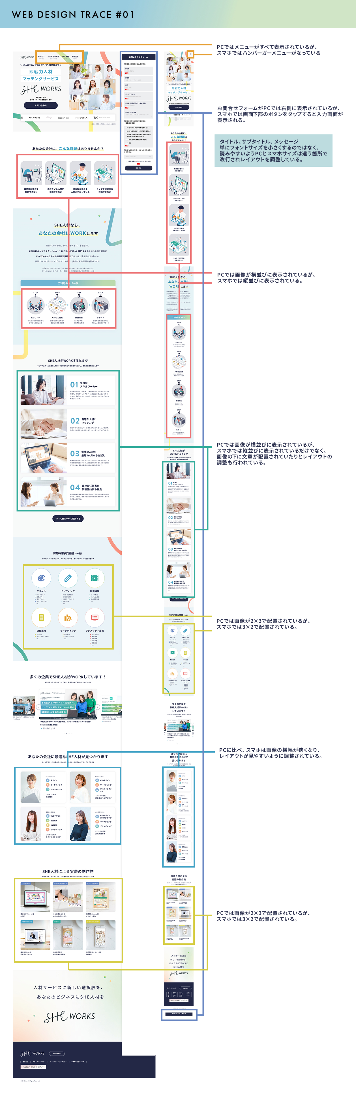 SHElikes MULTI CREATOR COURSEの課題にて、LPをトレースし、PCとスマホサイズで異なる点の分析をまとめました。 【制作期間】約15時間 【使用ツール】Photoshop