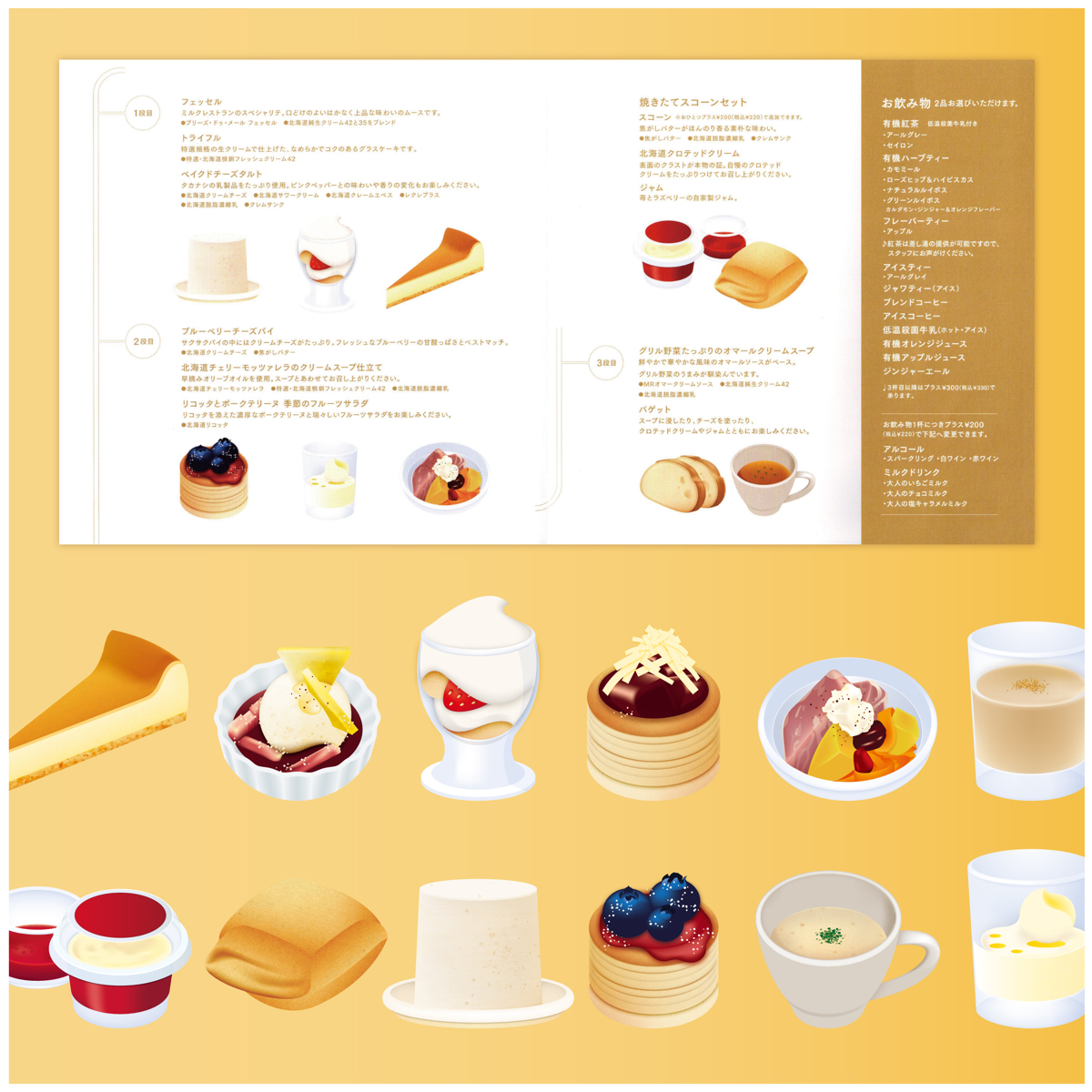 みなとみらいにあるタカナシ ミルクレストランの [ WHITE CHEESE AFTERNOON TEA ] メニューのイラストを描きました。描く前に、アフタヌーンティーをいただき、色々なチーズを味わい、盛り付けの細かい部分まで描くことが出来たと思っています。メニューのデザイン・レイアウトは、デザイン学校時代からの友人が制作し、初めて合作しました ☻*☻