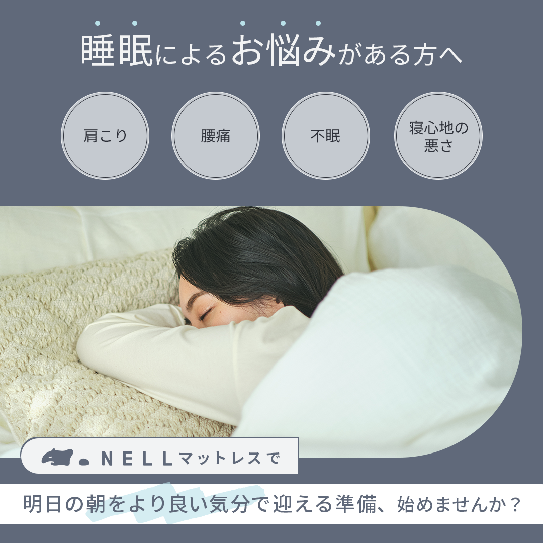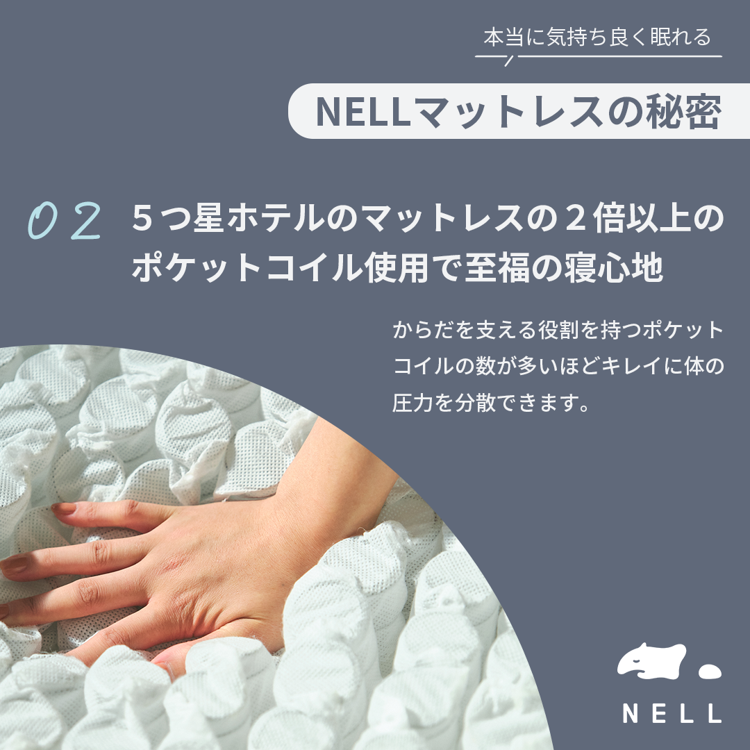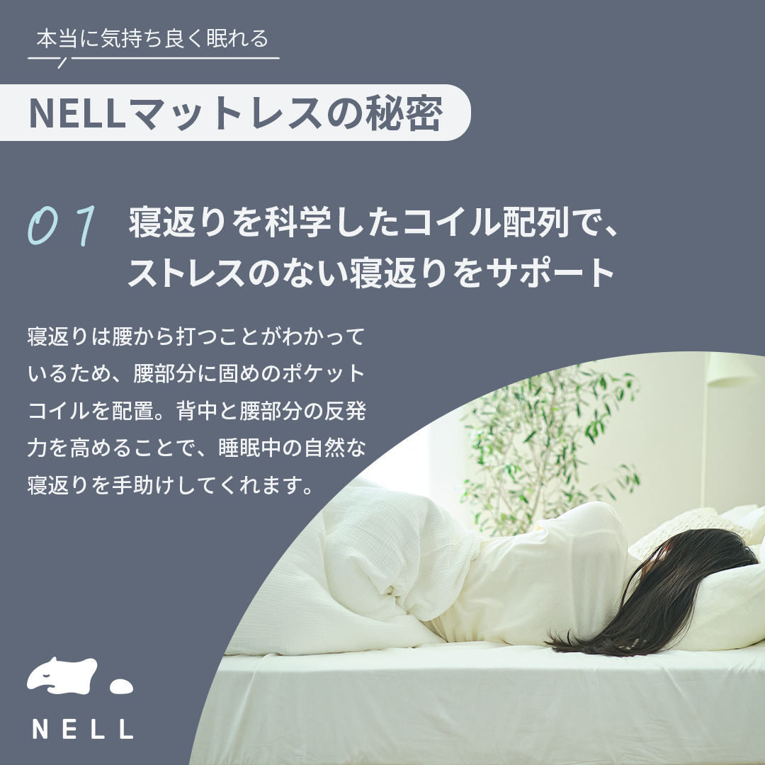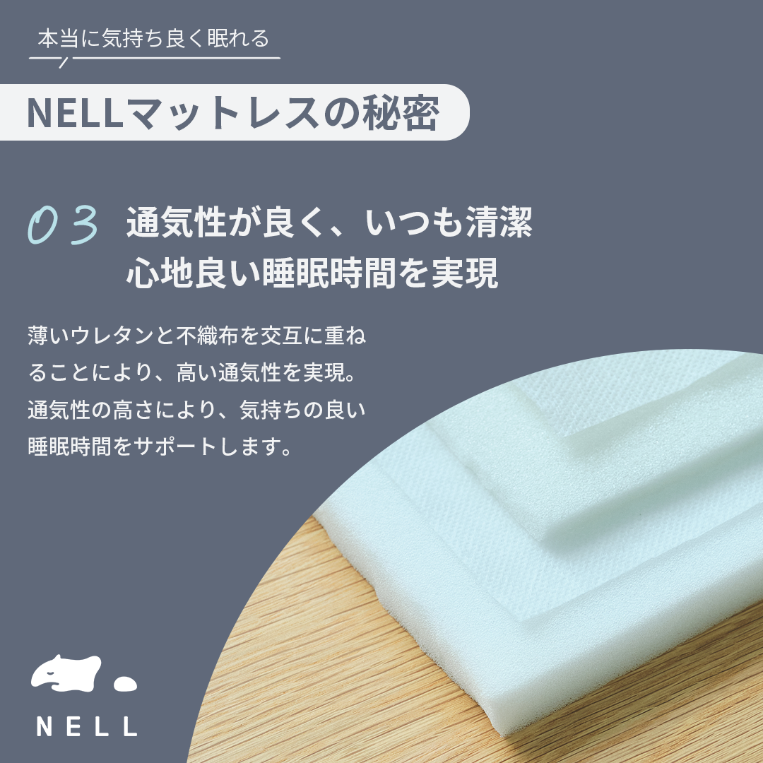 ブランドDNAにあるカラーパレットよりカラーを使用。マットレス=夜に使うことが多いため、静かな夜を感じられるよう、ブランドDNA本来のベースカラーとアクセントカラーをチェンジして使用しましたが、NELLのデザインである、シンプルでナチュラルな印象はそのままになるよう気をつけました。