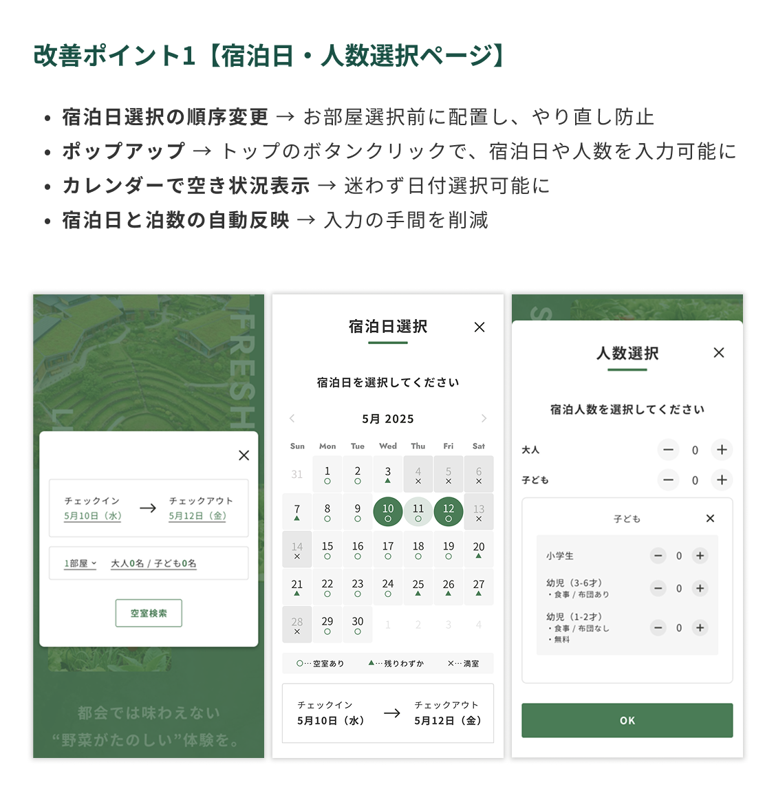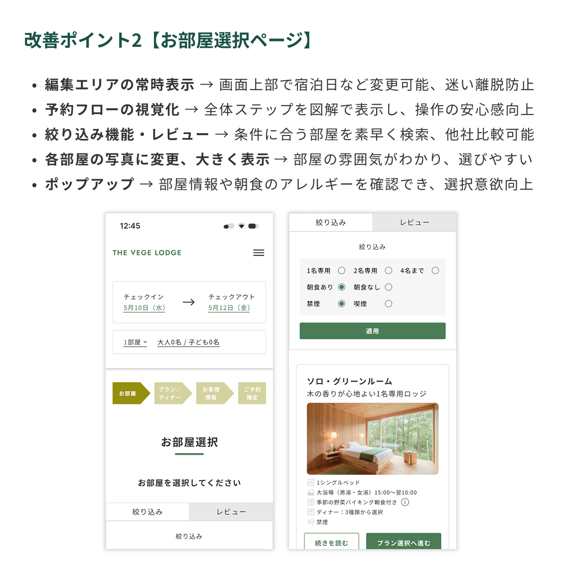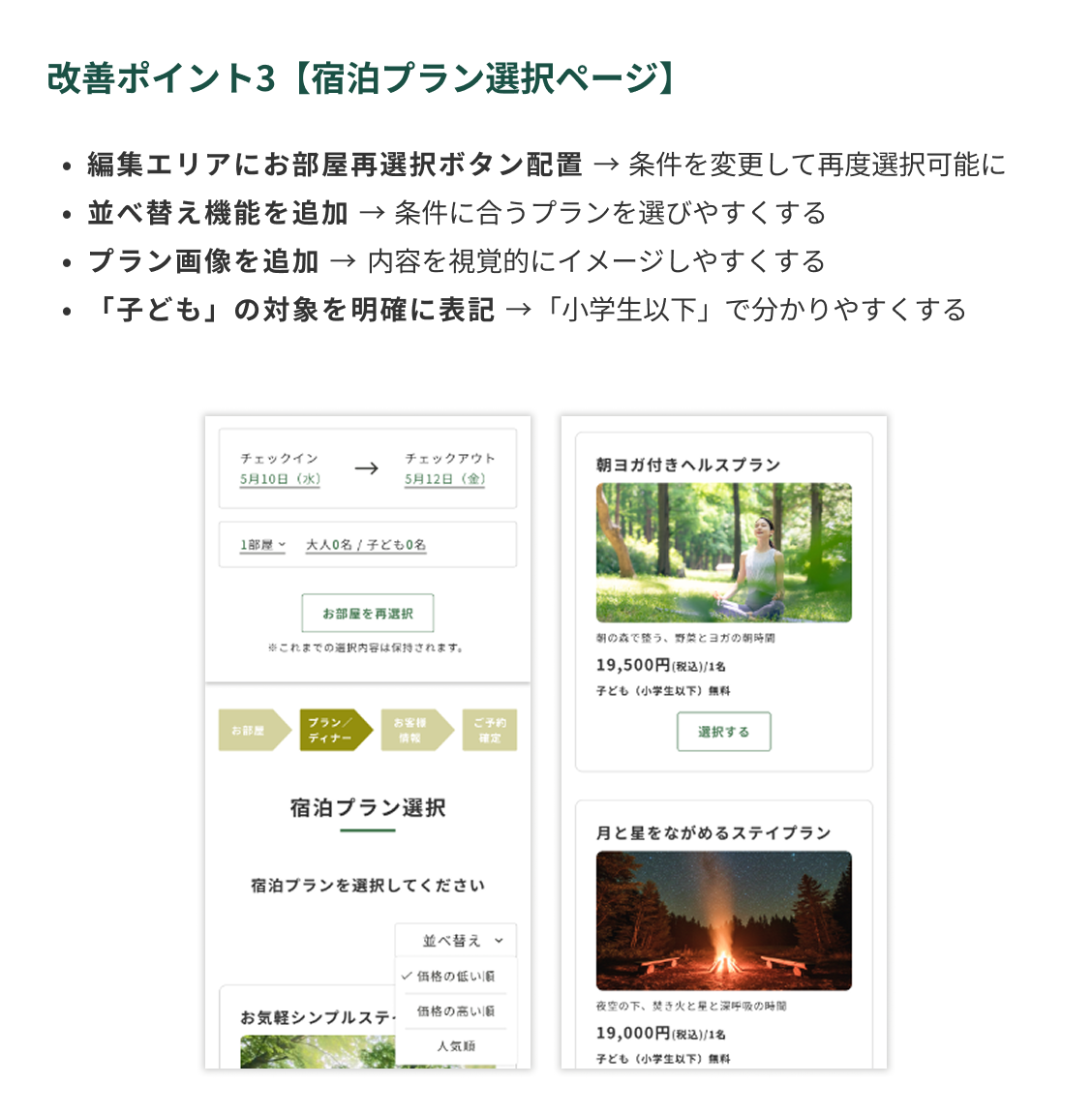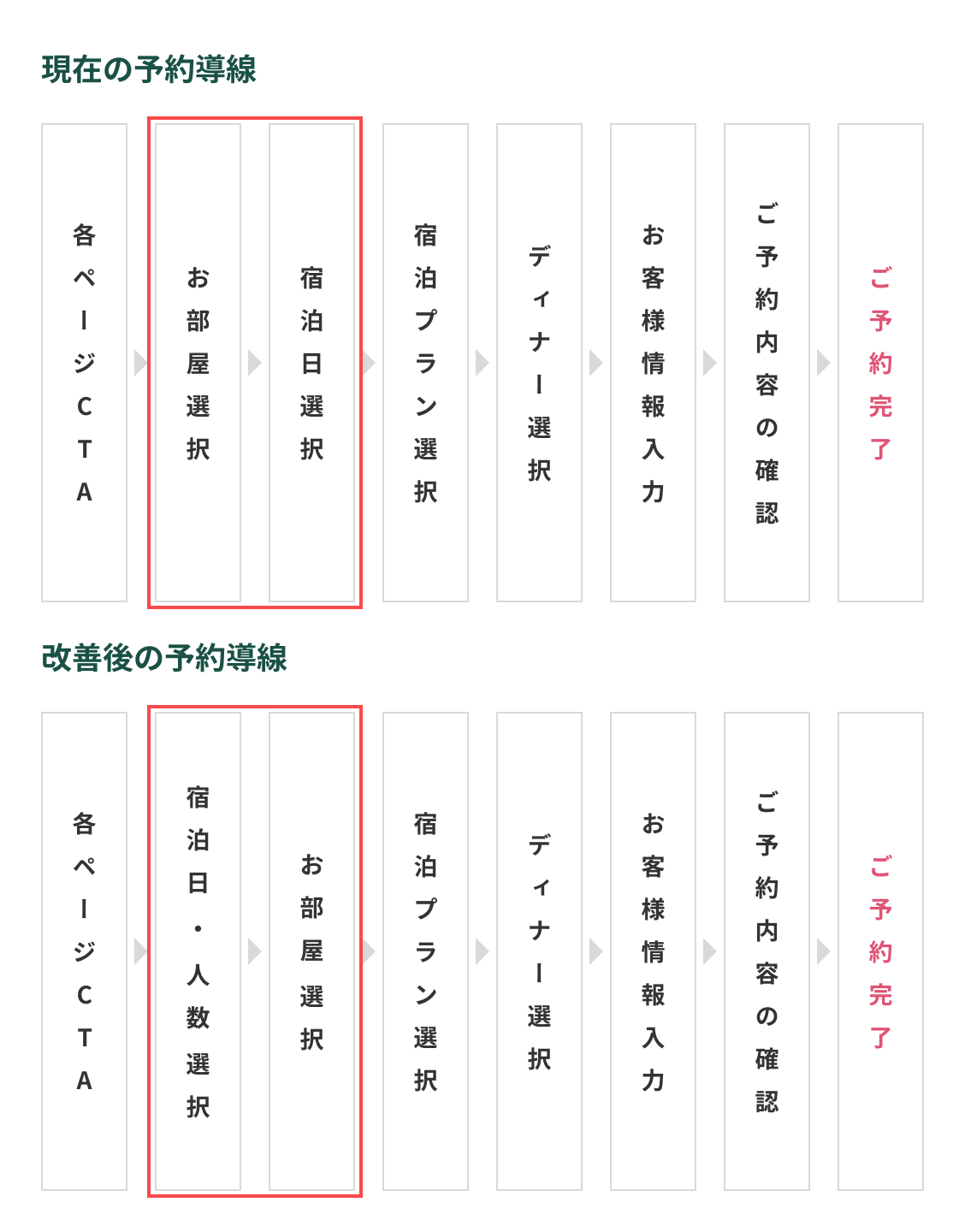 - お部屋選択後に宿泊日を選択すると空室がない場合やり直しが発生するため、ページ順の入れ替えを提案