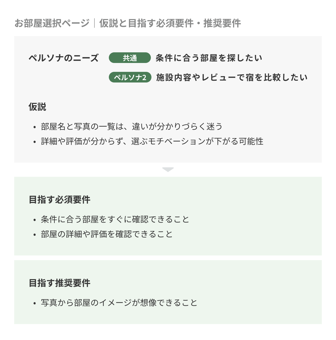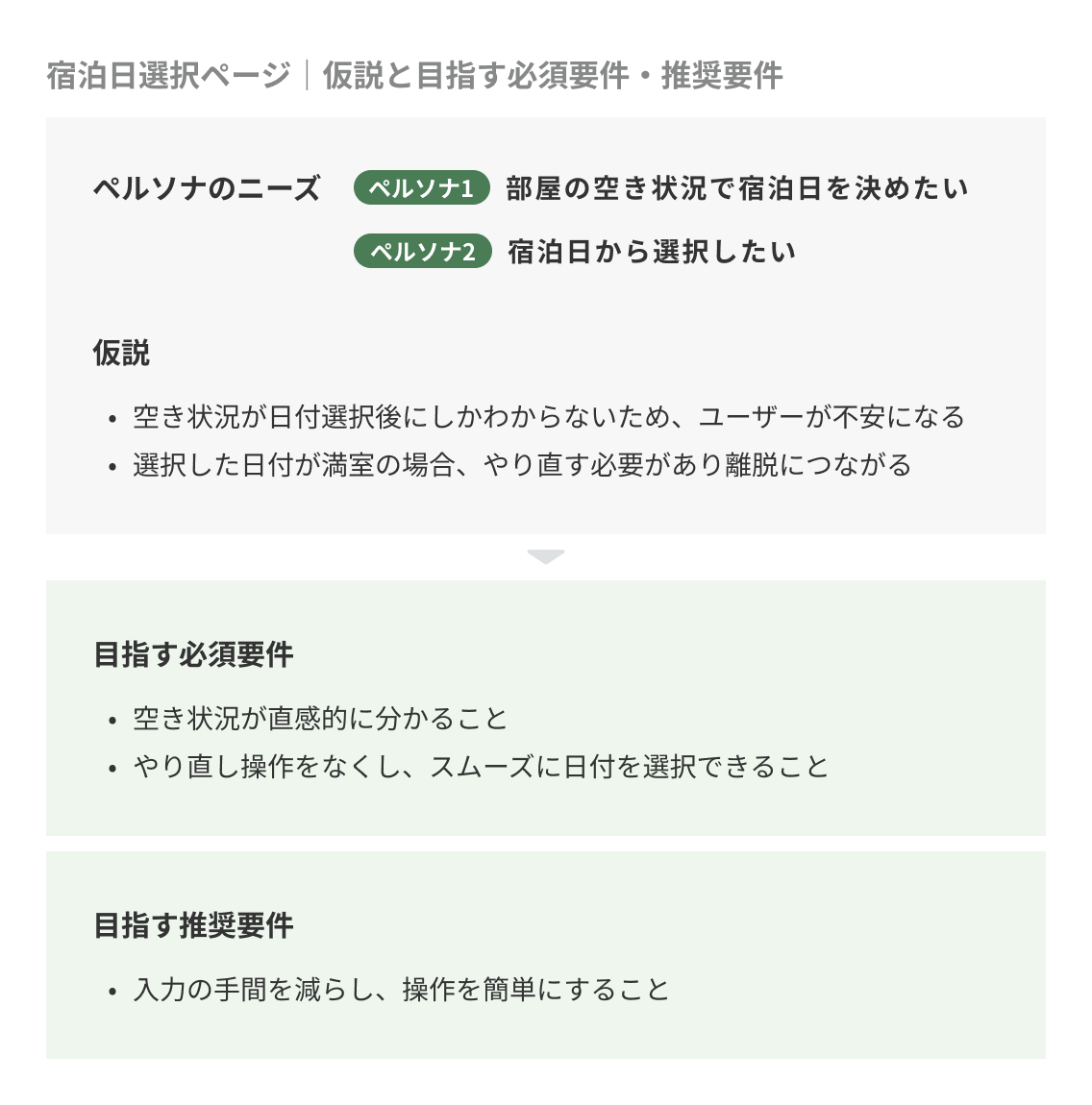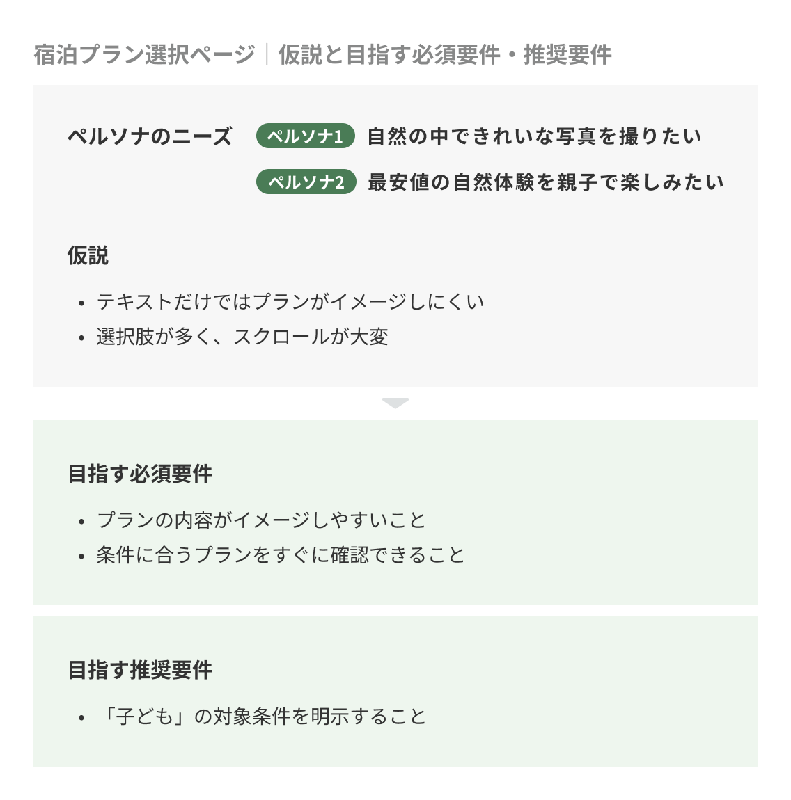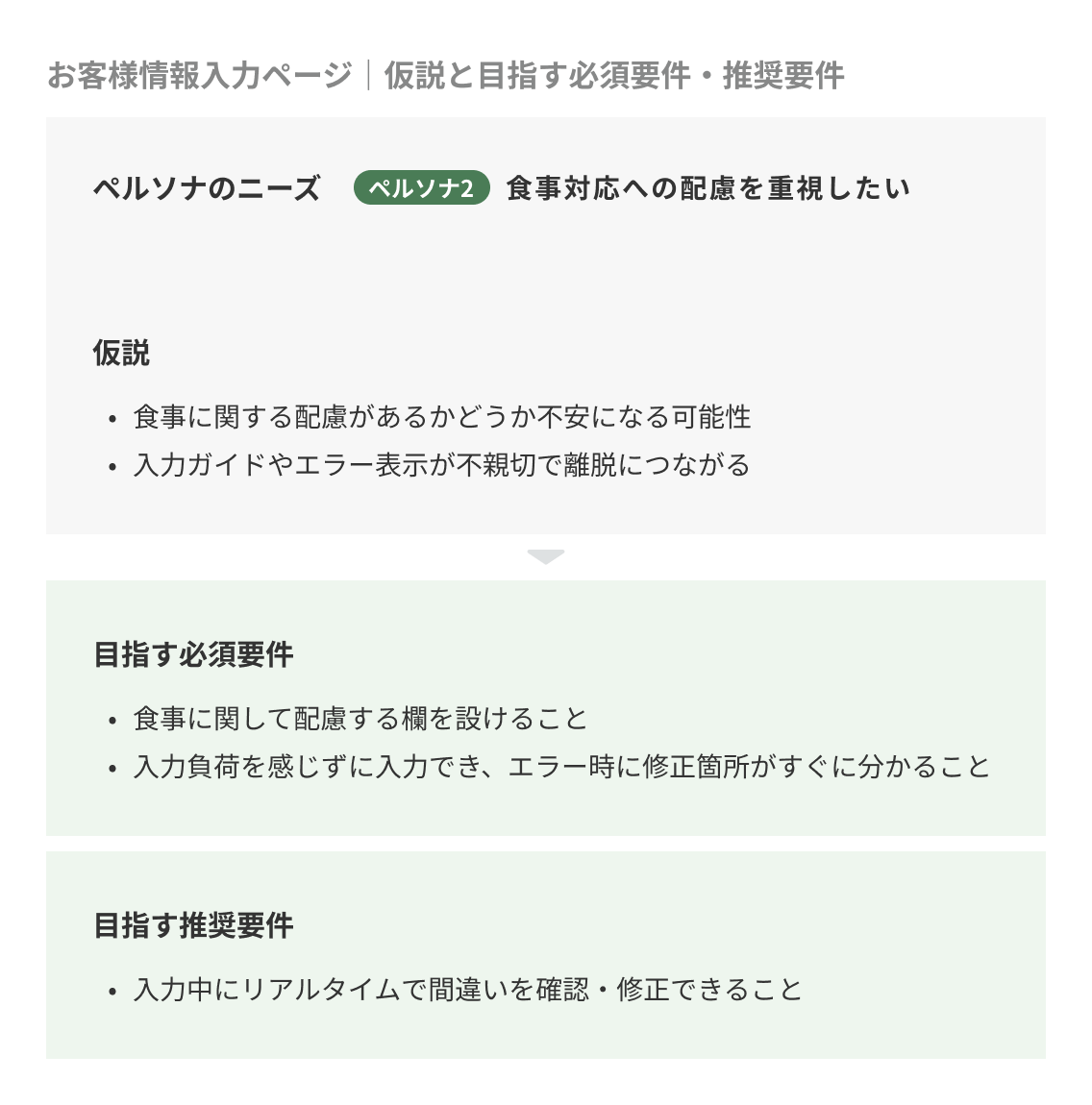 - 仮説をもとに、改善デザインで目指す「必須要件・推奨要件」を定義