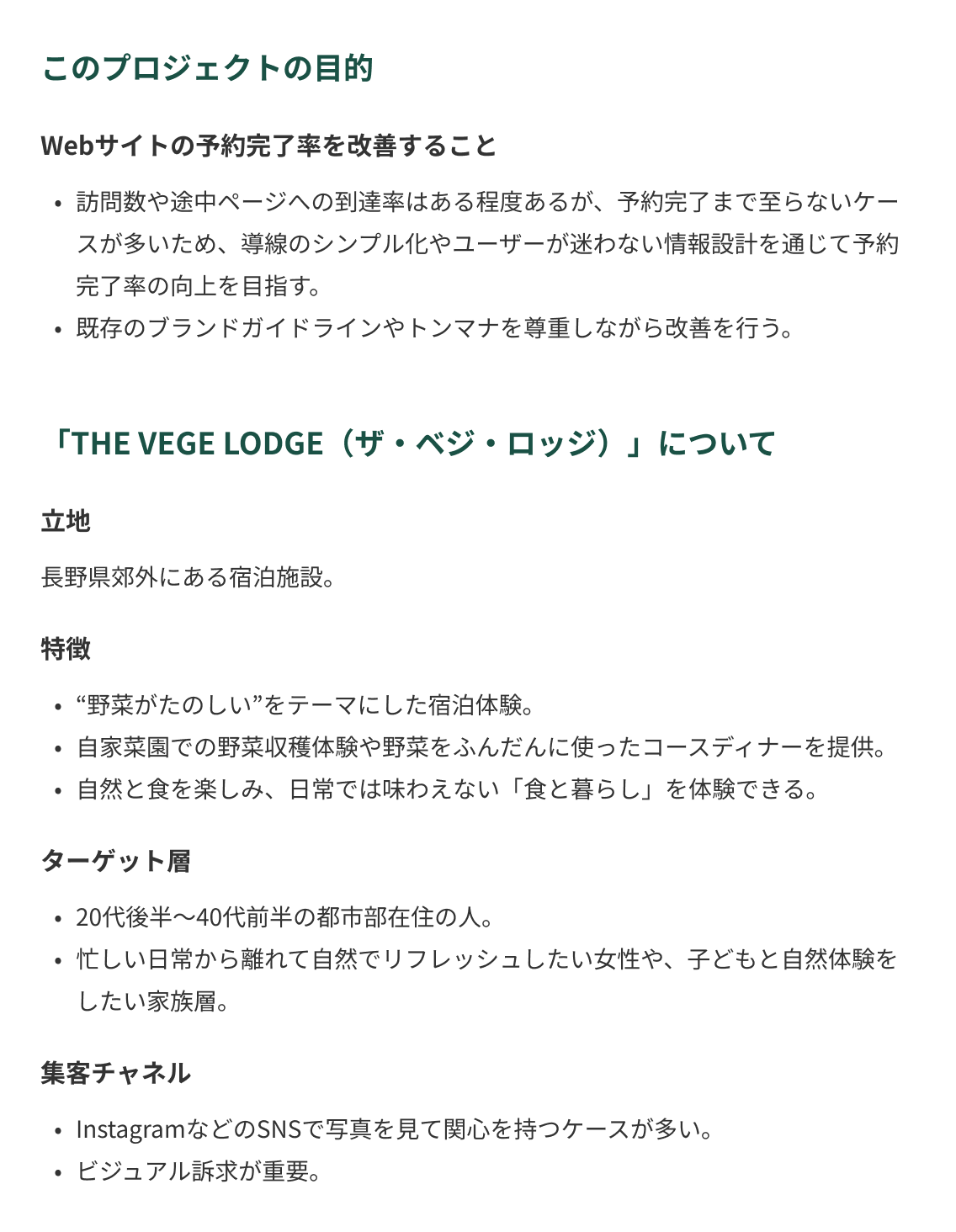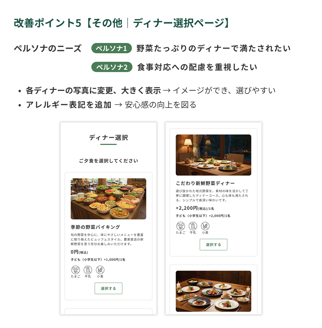 - ユーザー(ペルソナ)の行動や心理から課題の仮説を立て、要件整理・改善提案・UI制作までの一連の流れを通して、目的に沿った改善の進め方を理解