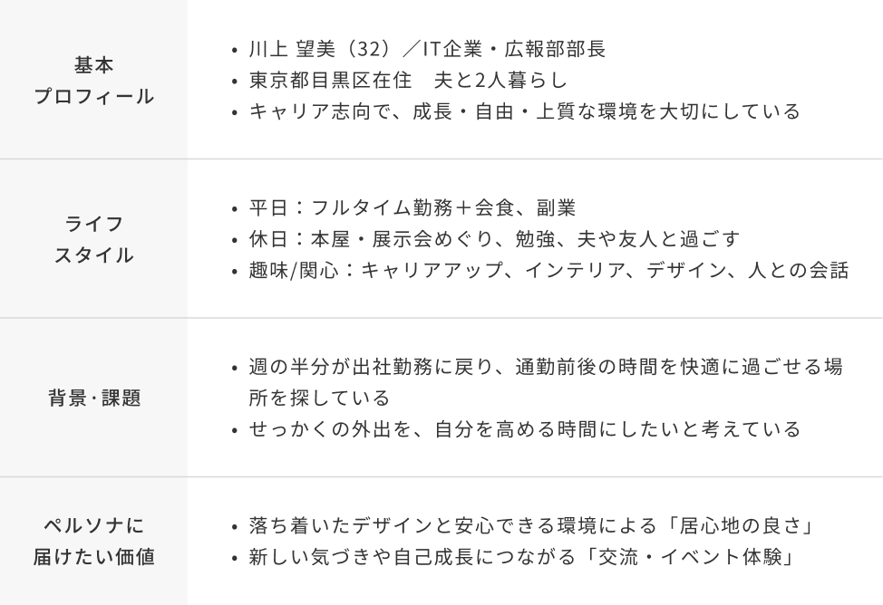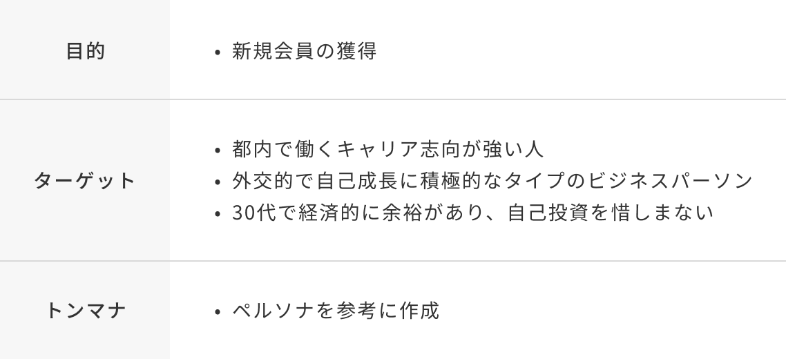 キャリア志向の強い30代ビジネスパーソンに向け、単なる施設紹介にとどまらず、「居心地の良さ」「交流の場」「自己成長の機会」の価値を伝え、求めている人の共感を促し、新規会員獲得につなげる。